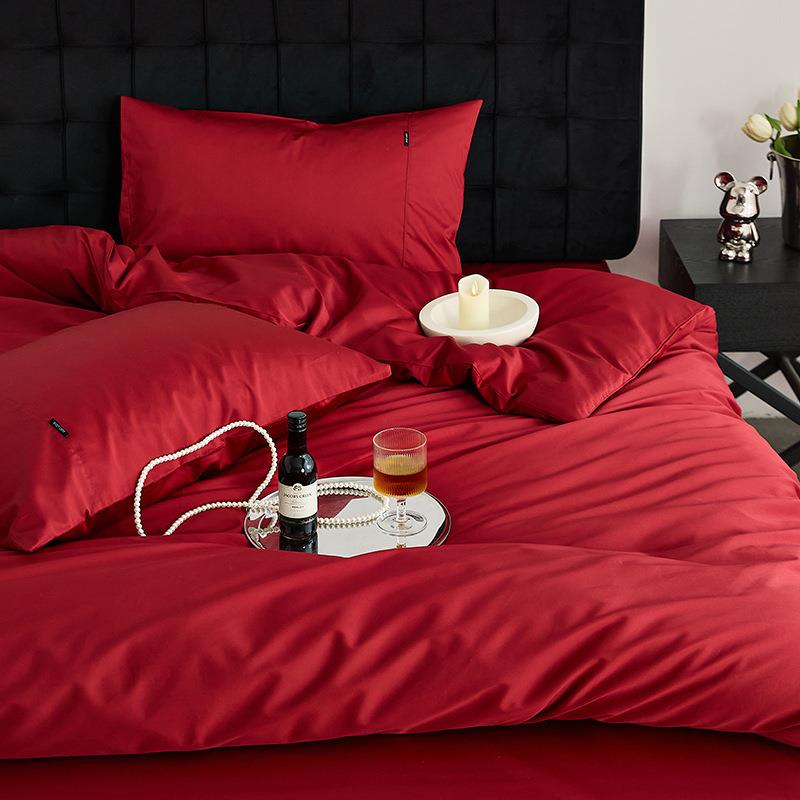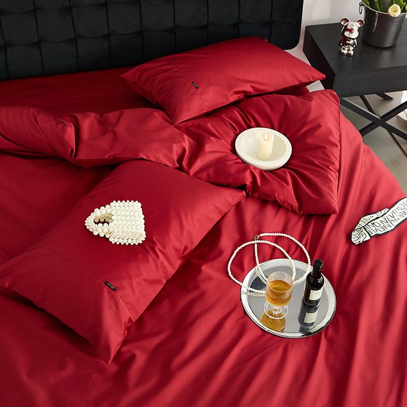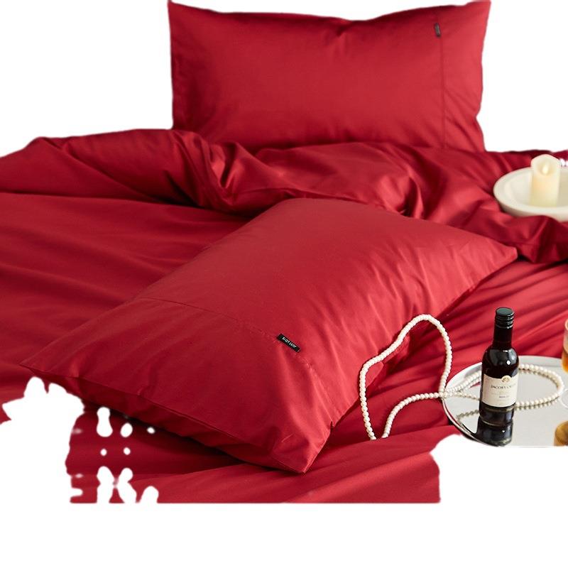 婚庆大红支贡缎长绒棉纯色四件套简约结婚纯棉被套床笠陪嫁