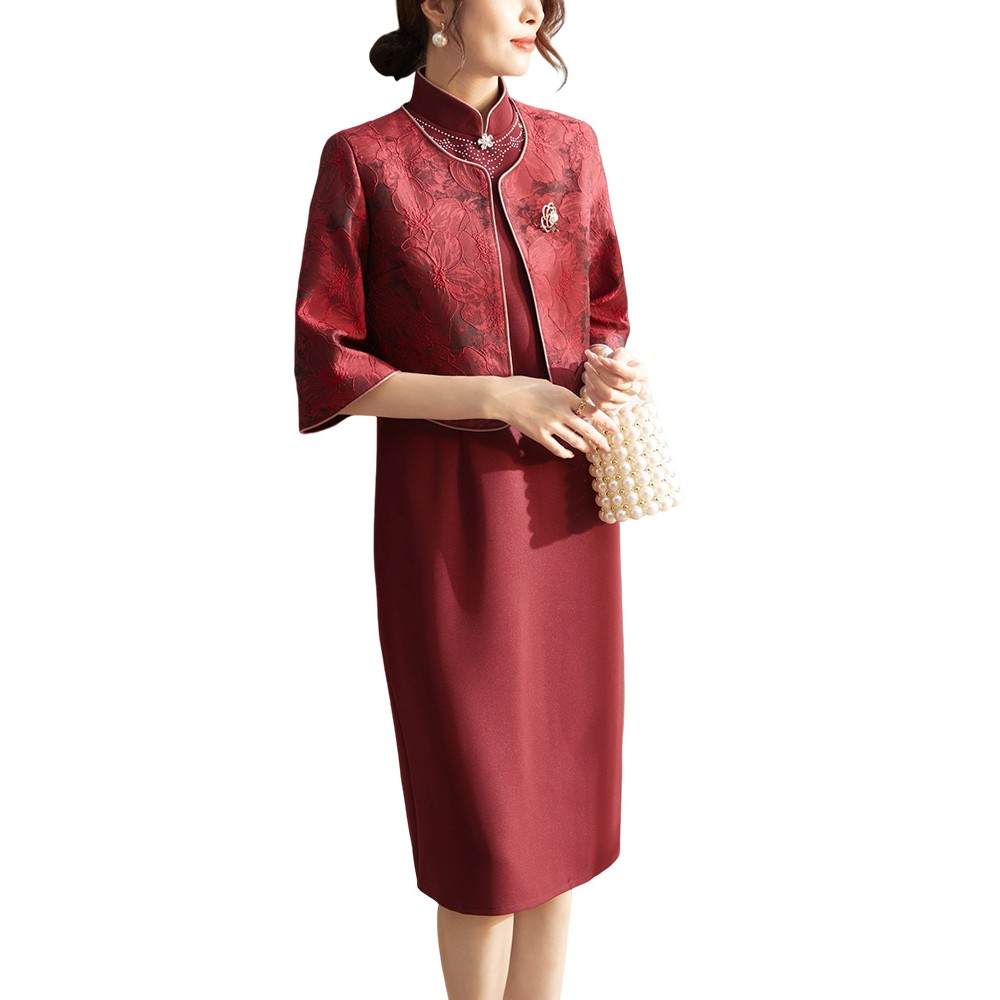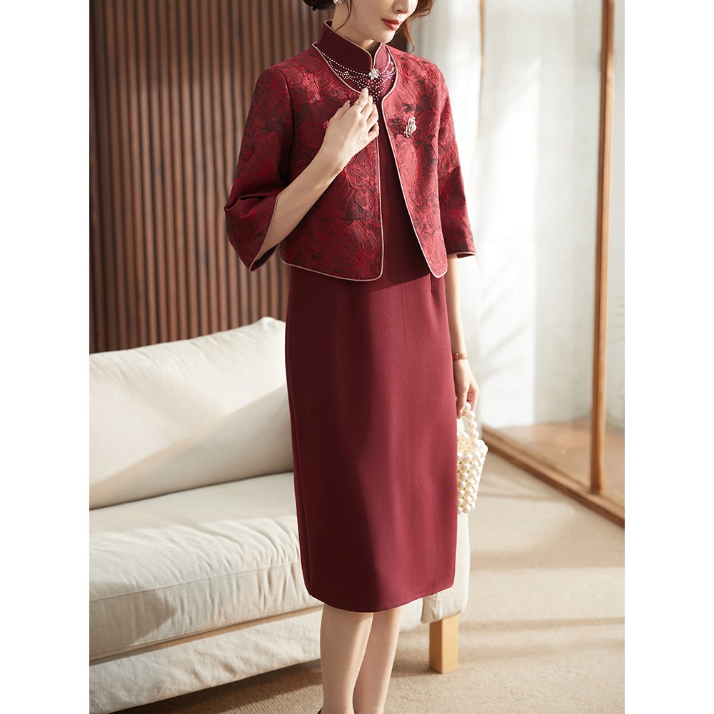 时尚妈妈洋气两件套连衣裙喜婆婆婚宴装贵夫人披肩婚礼高贵旗袍裙