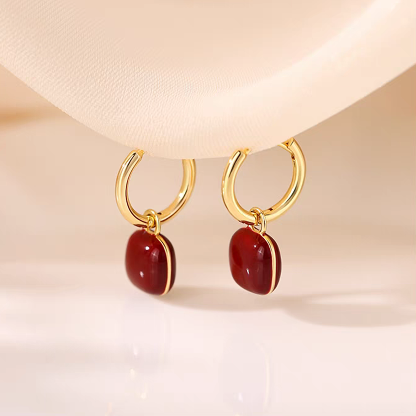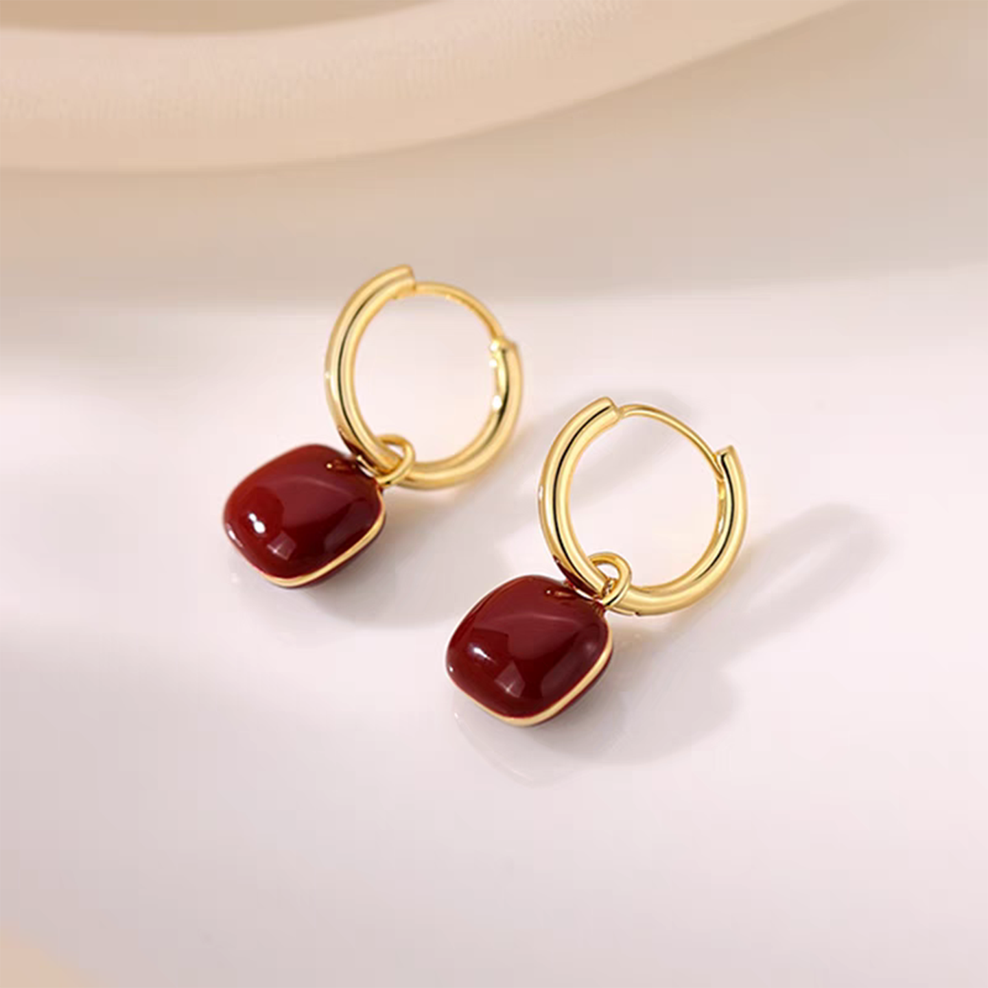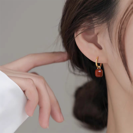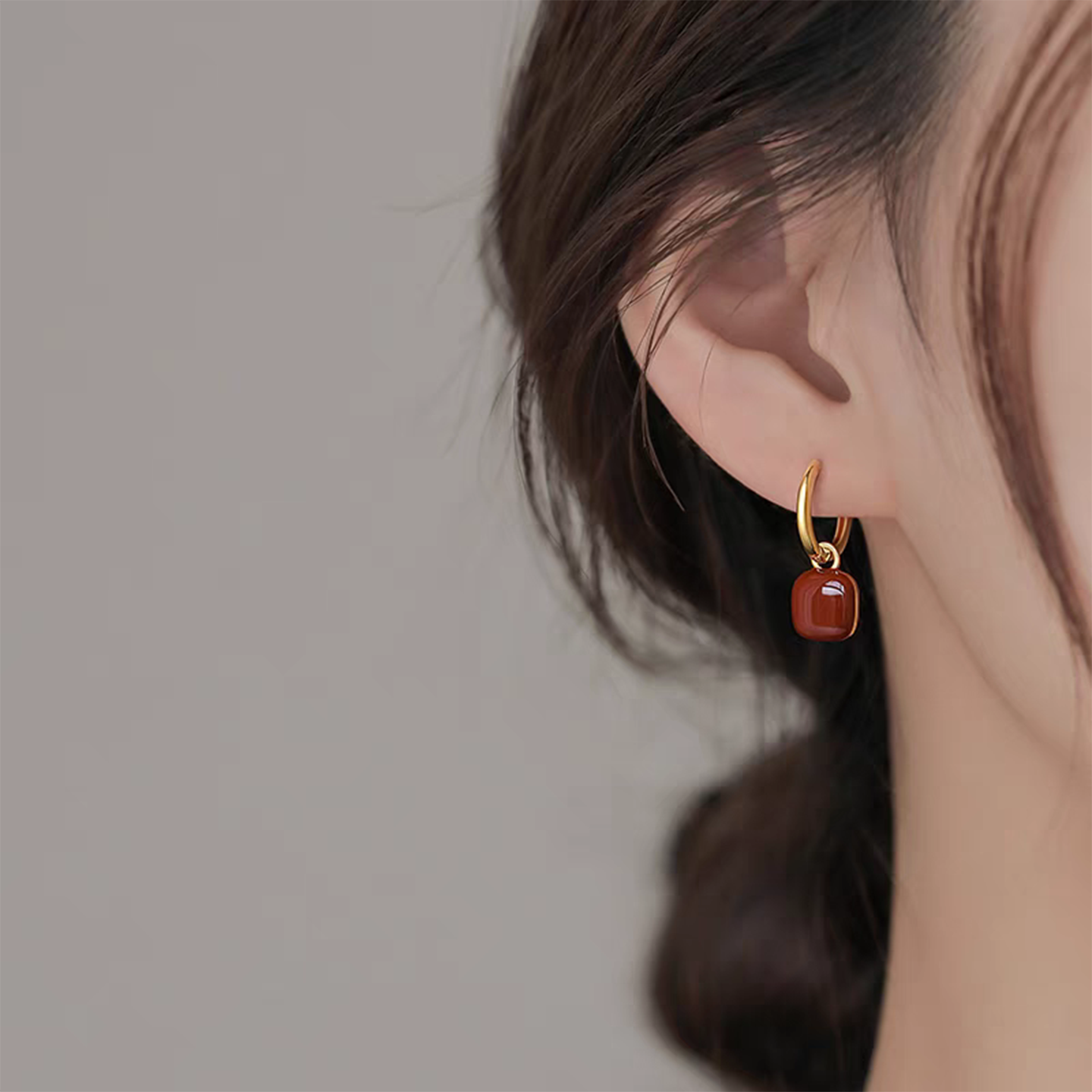 红色方形耳坠高级感925银针耳环女轻奢气质耳钉耳扣耳圈网红耳饰