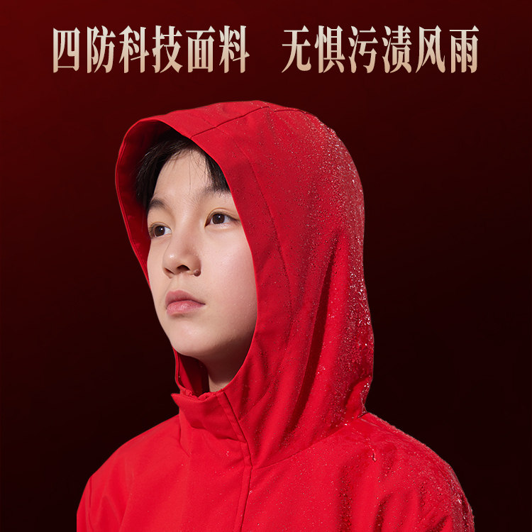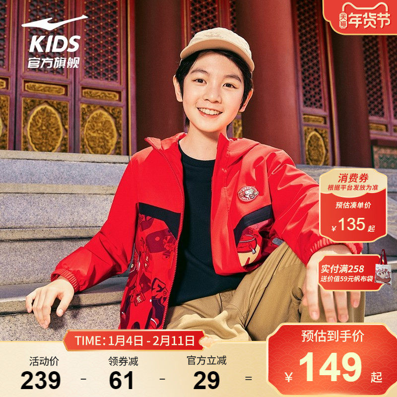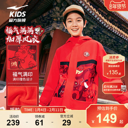 鸿星尔克童装男童新年红色加厚风衣大童秋冬款儿童摇粒绒运动外套