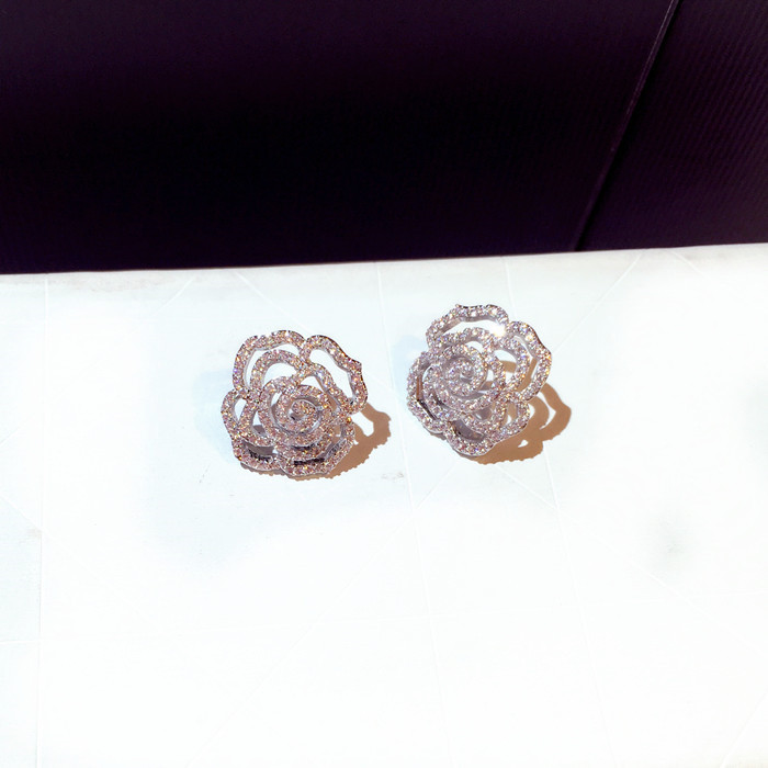 银色玫瑰花朵微镶钻耳钉女气质韩国个性简约耳环潮人百搭耳饰品