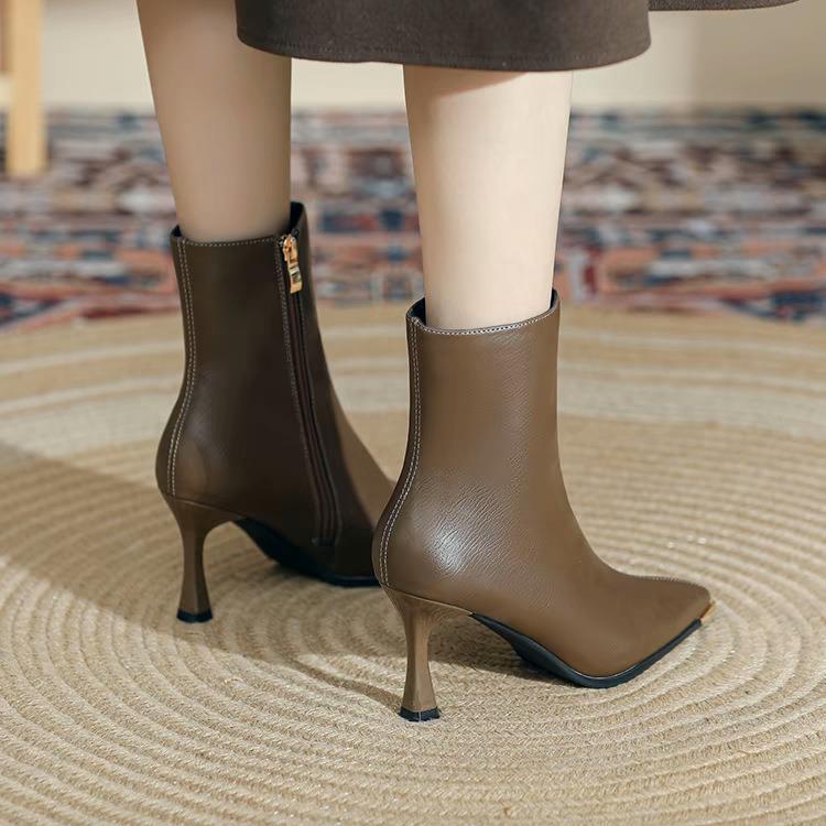 学院风增高显瘦秋冬新款尖头细跟高跟鞋软皮小跟短靴踝靴女中跟鞋
