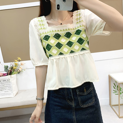 短袖女2025夏法式方领镂空小衫设计感小众拼接雪纺泡泡袖短款上衣