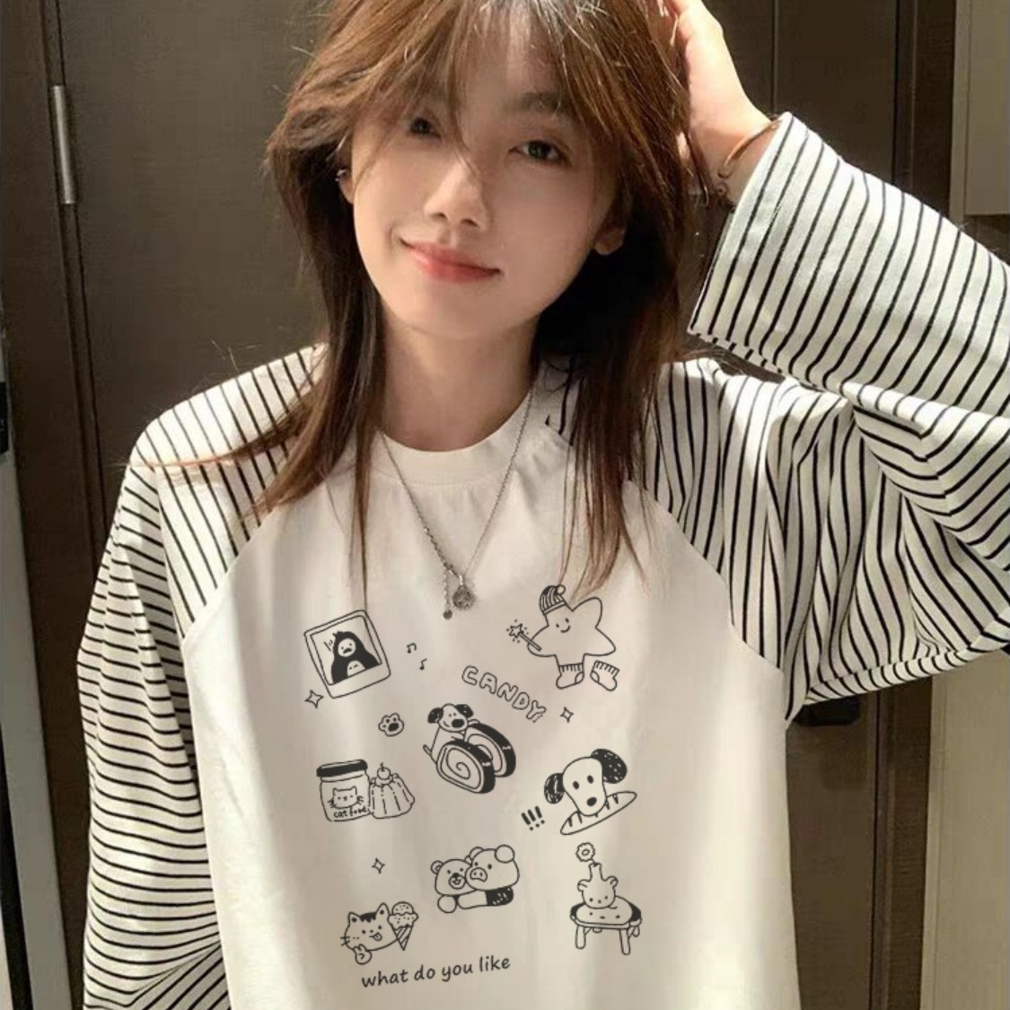 气质可爱趣味印花打底衫纯棉T恤女秋冬季宽松学生长袖慵懒风上衣