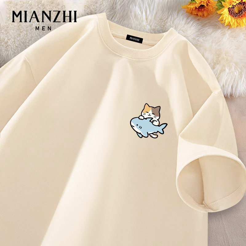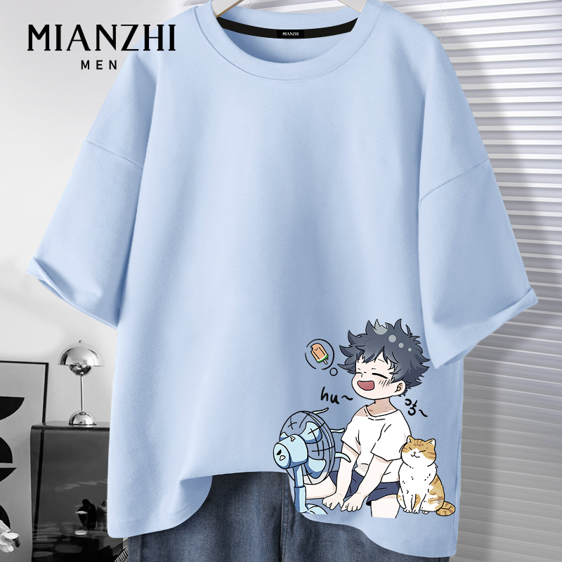 棉致卡通小猫蓝色纯棉短袖男款t恤夏季青少年大码休闲宽松上衣服