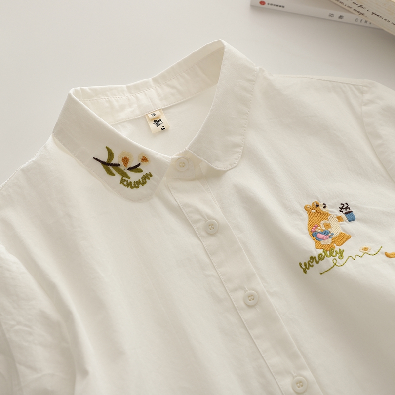 夏季文艺小清新可爱减龄刺绣纯棉短袖白色衬衫女学生百搭半袖上衣