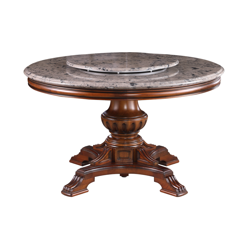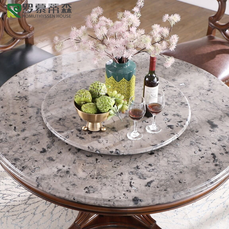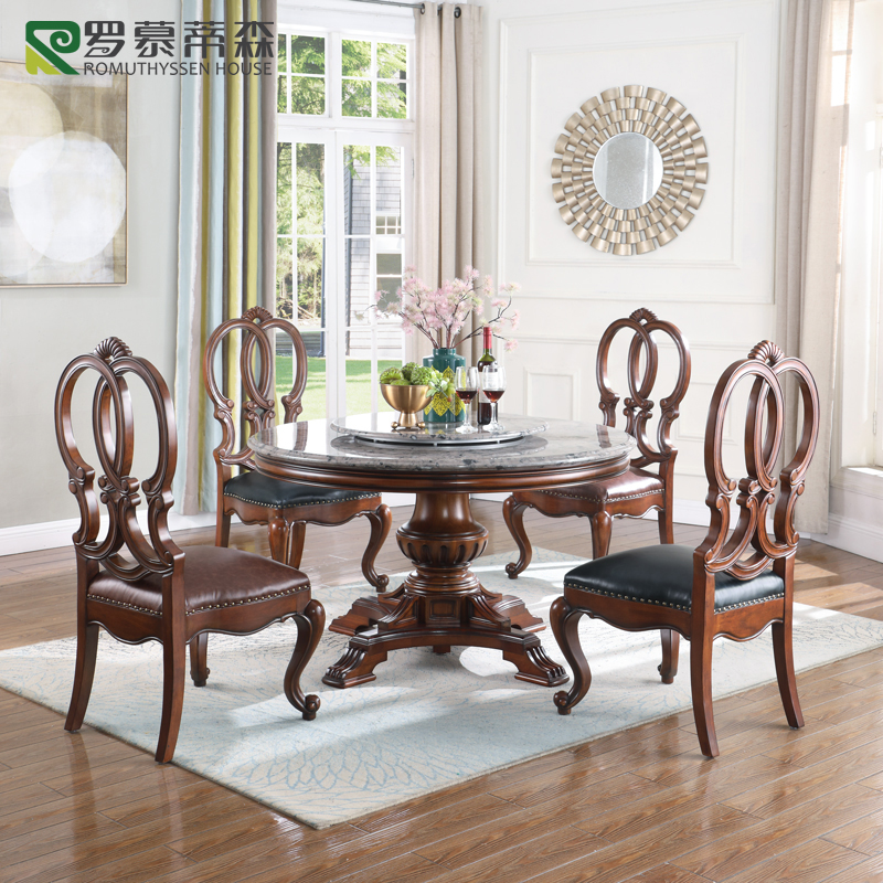 美式实木带转盘天然大理石餐桌欧式圆形餐桌椅组合大圆桌家用高端