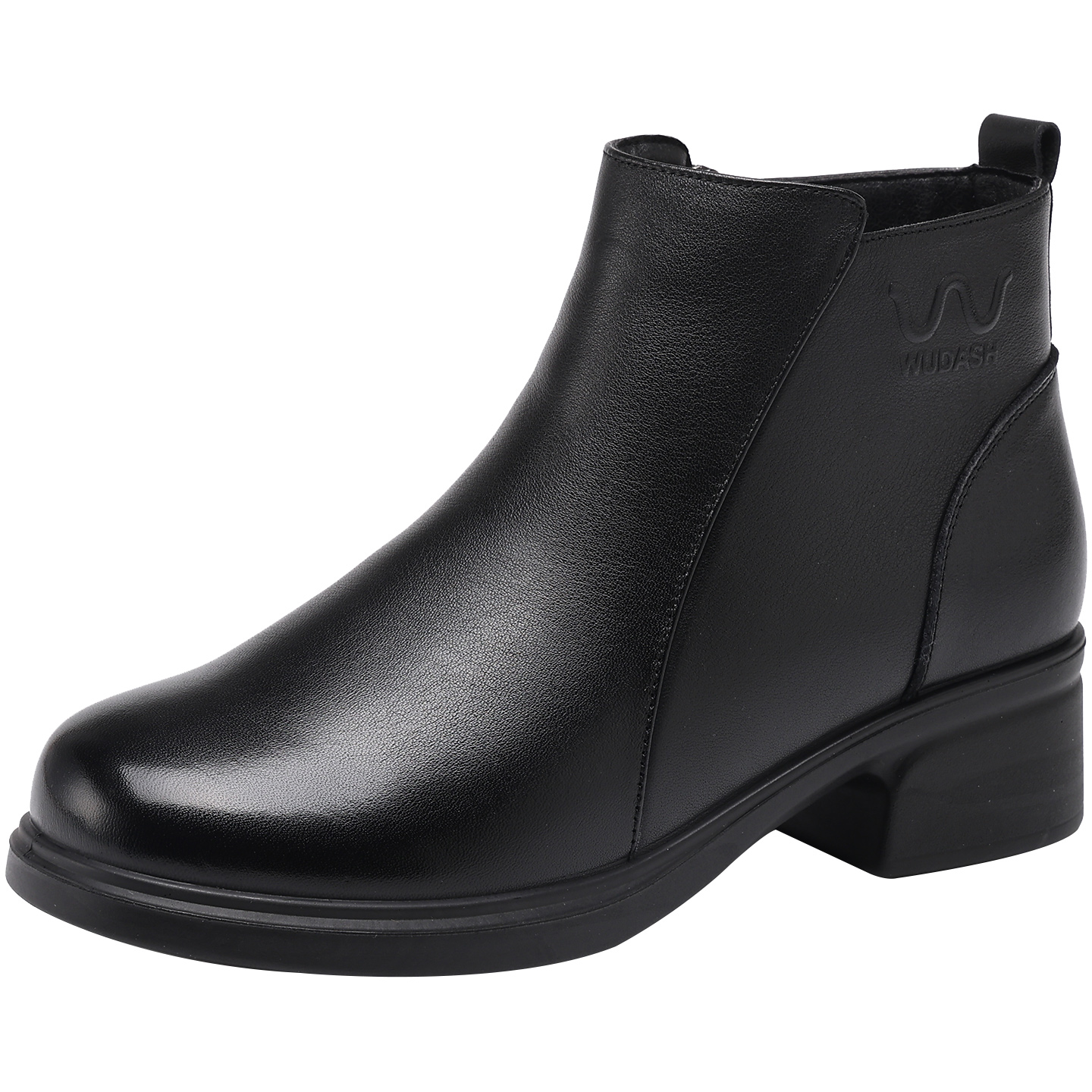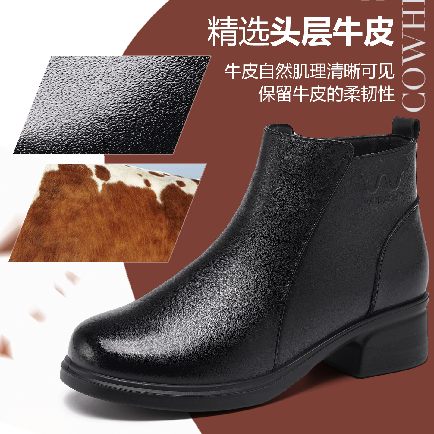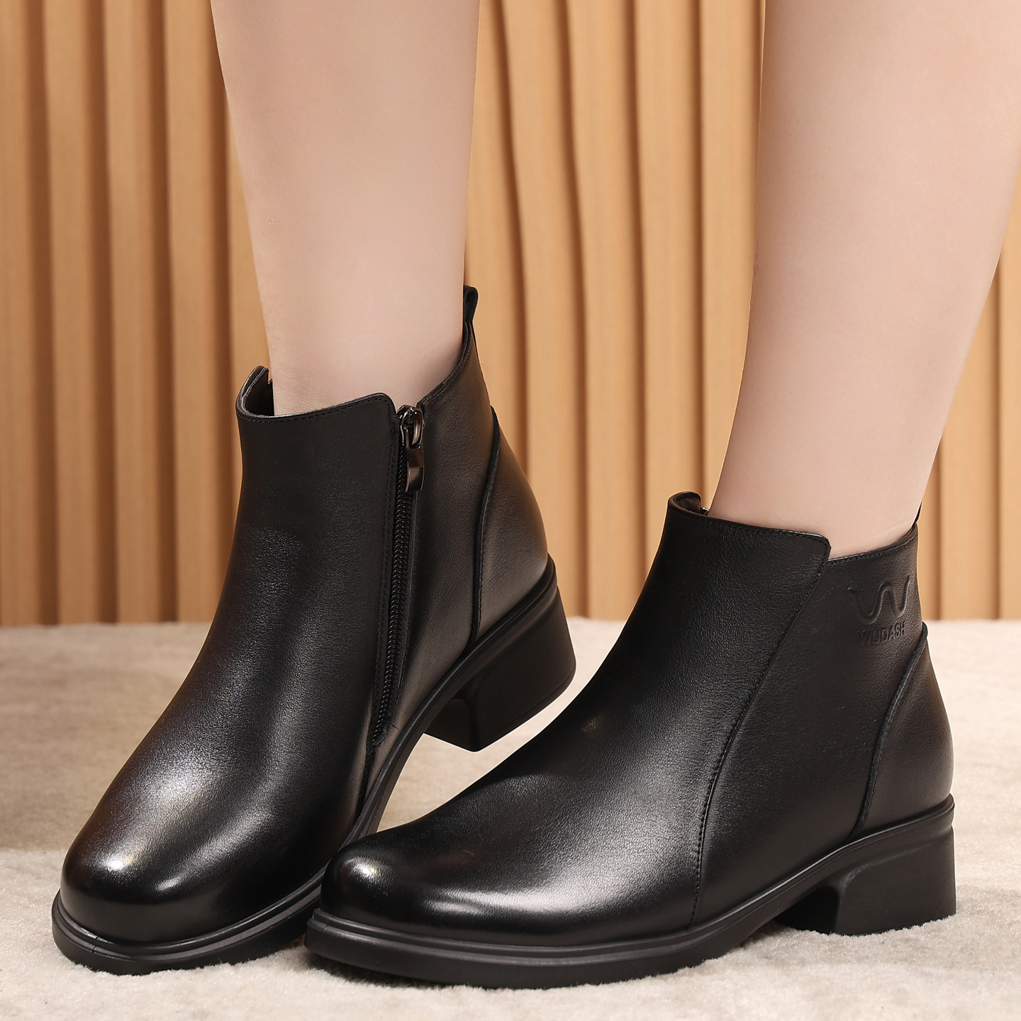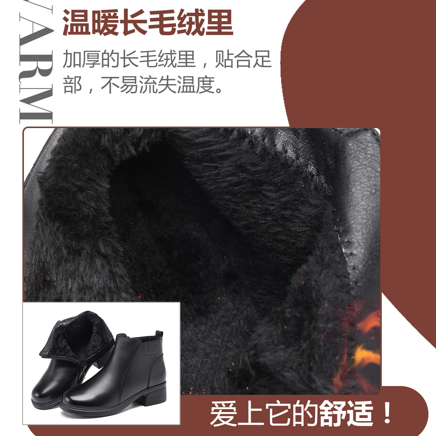 妈妈女士棉鞋真皮软底短靴冬季加绒保暖粗跟靴子中年防滑中跟女靴