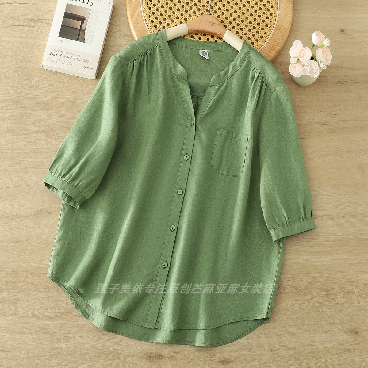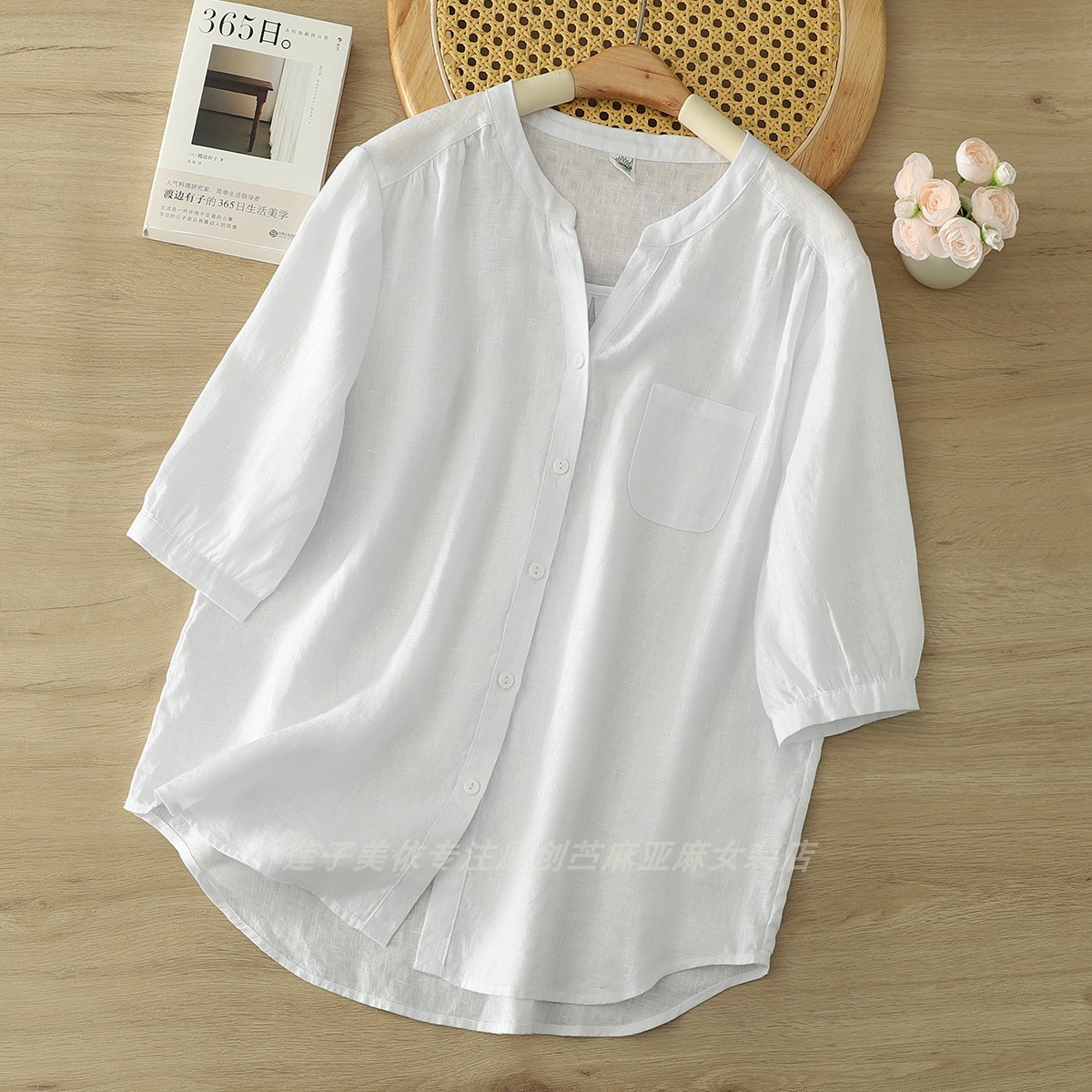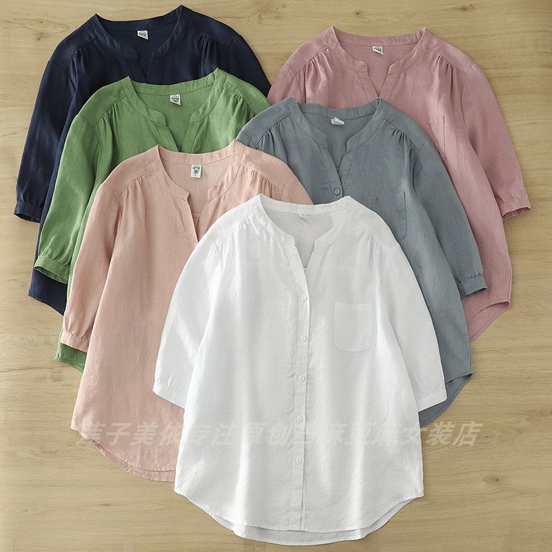 100纯亚麻百搭纯色V领大码简约衬衫宽松休闲韩版夏装棉麻上衣