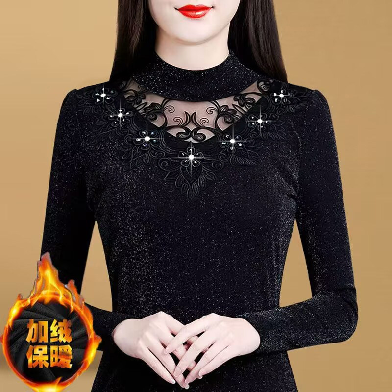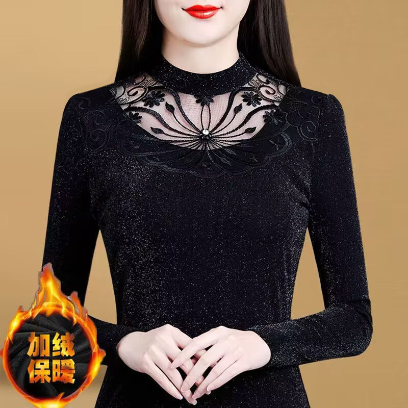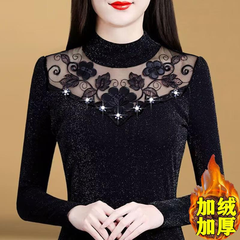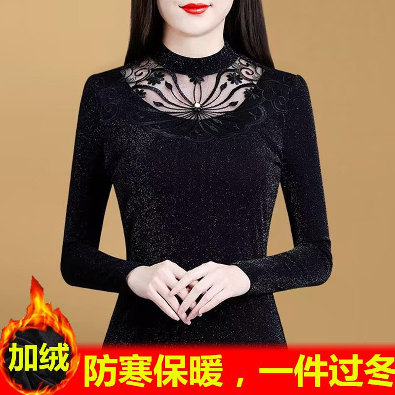 加绒加厚蕾丝打底衫女秋冬季保暖内搭洋气半高领大码网纱上衣
