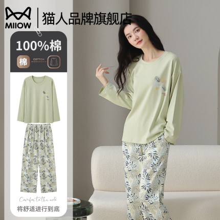 猫人女士纯棉睡衣2025新款春秋薄款长袖长裤宽松可外穿家居服套装