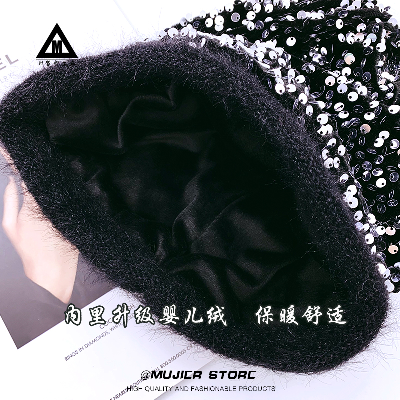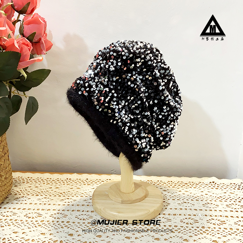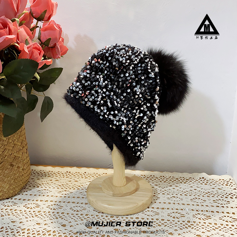 秋冬新品重工亮片堆堆帽女休闲时尚仿貂绒狐狸毛球保暖套头毛线帽