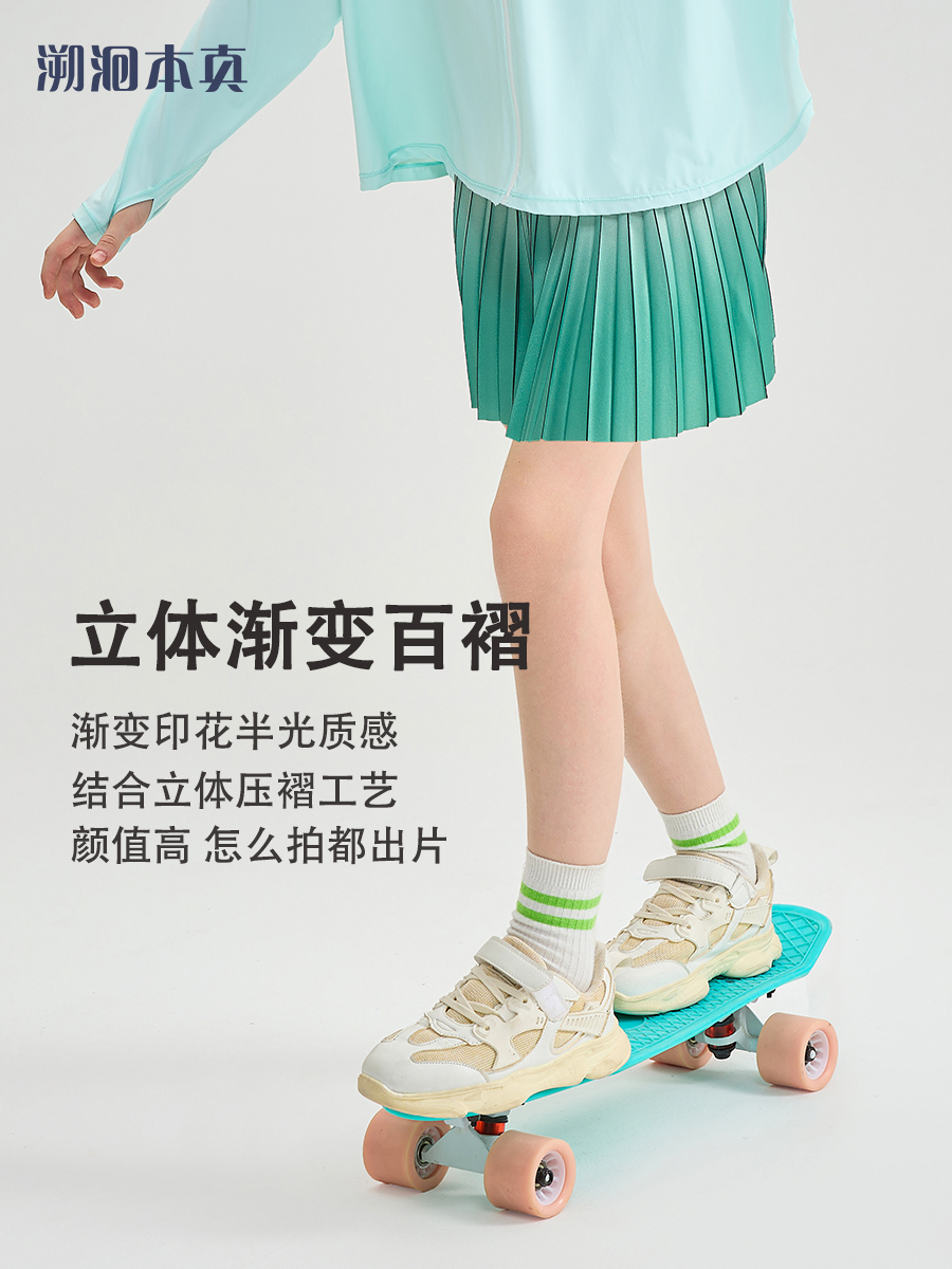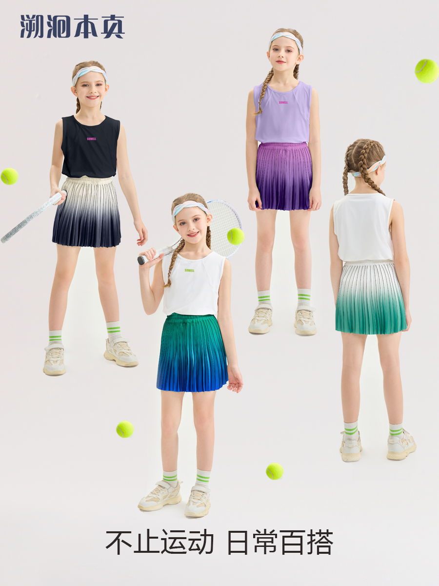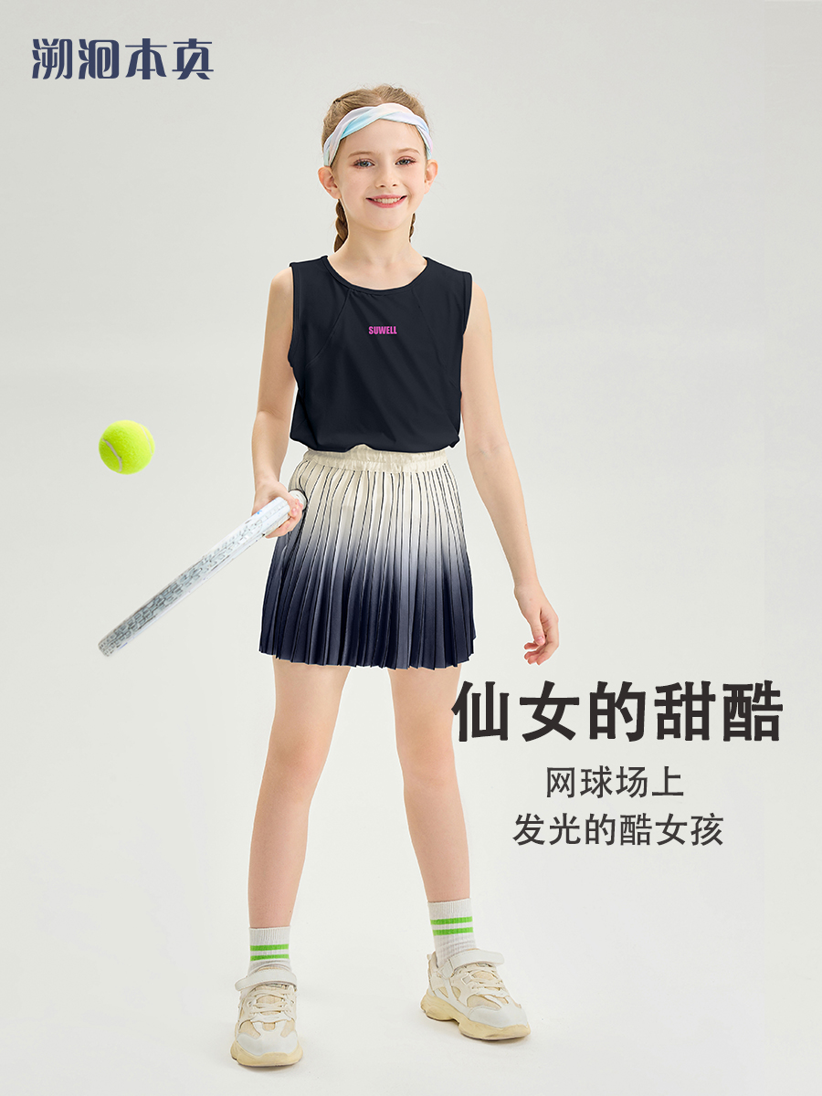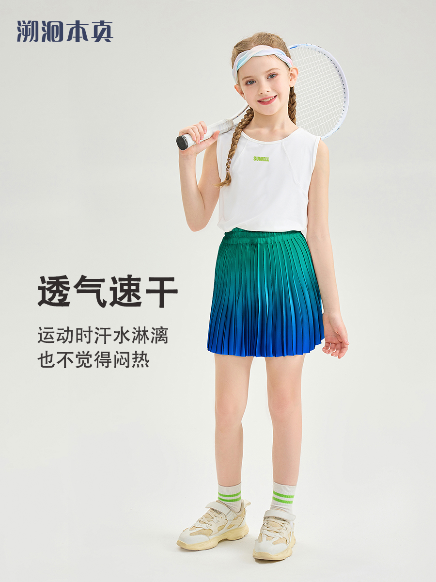 女童渐变色半身裙夏款压褶新款中大童运动百褶裙短裙网球裙防走光
