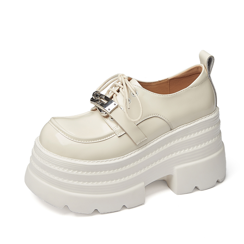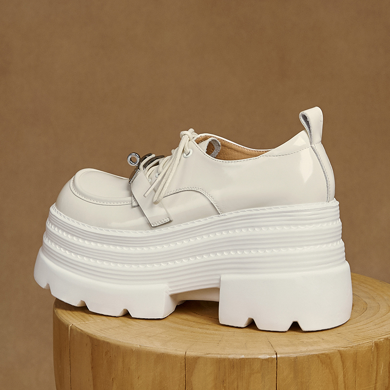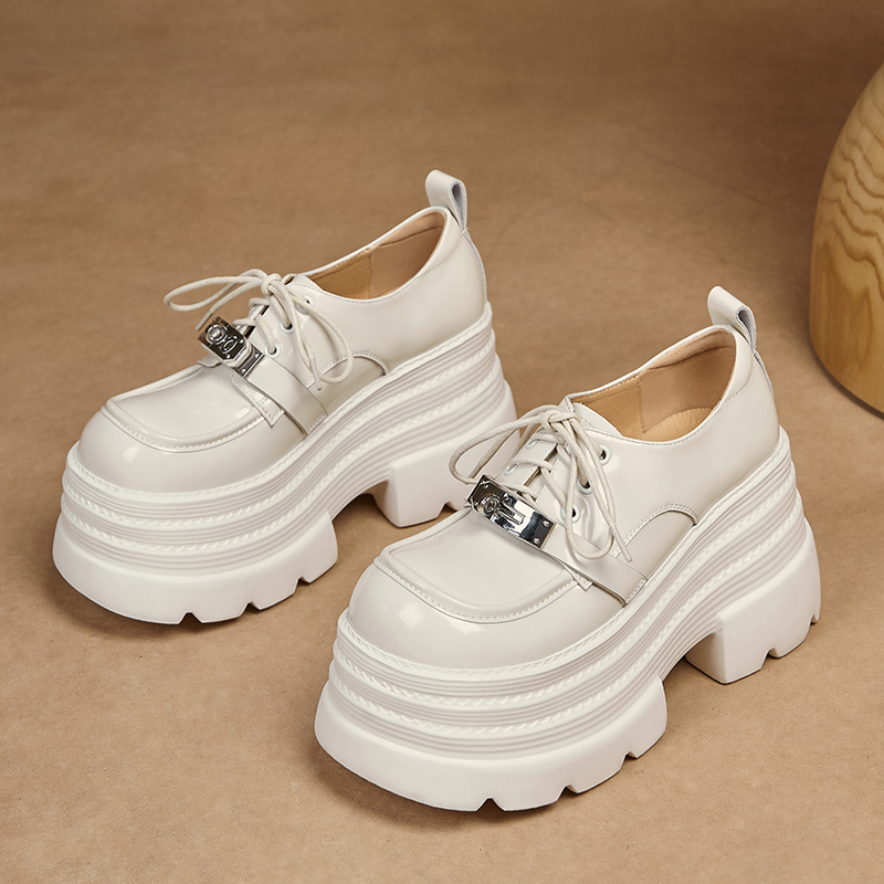 学院风新款漆皮女鞋厚底增高休闲鞋全真皮单鞋绑带松糕乐福鞋金属