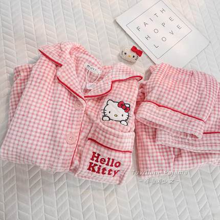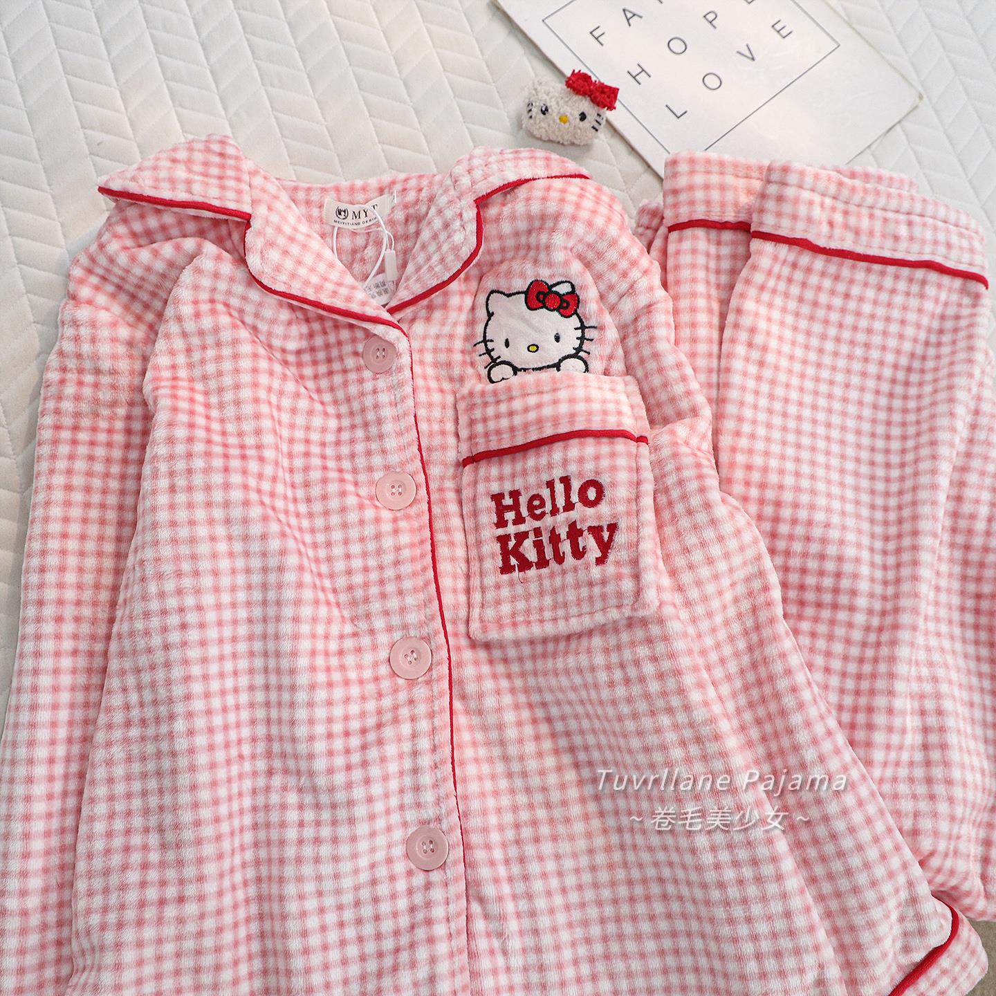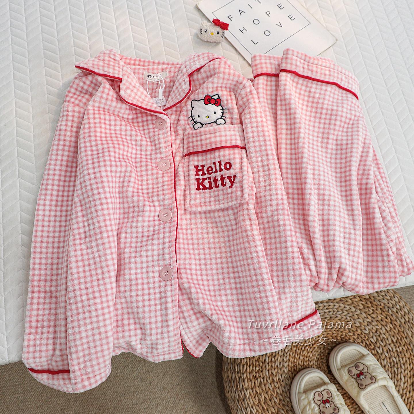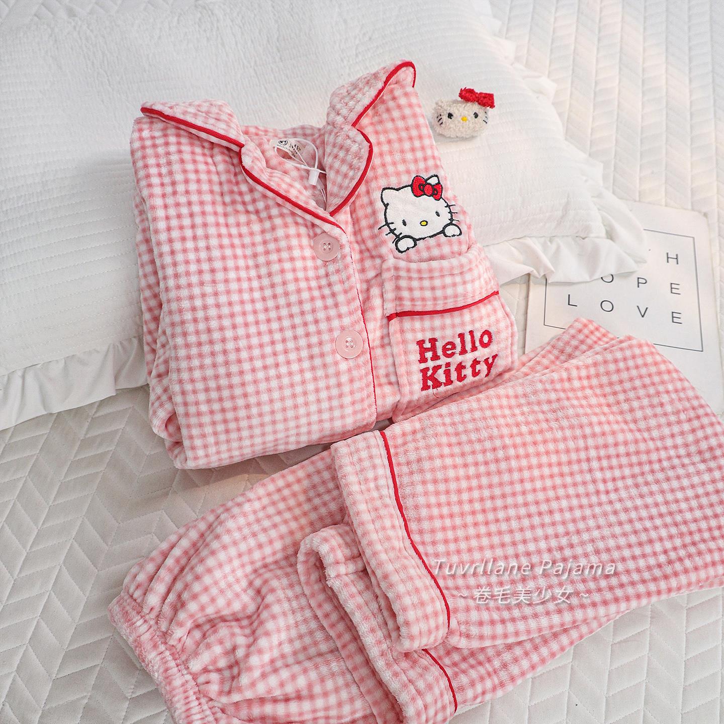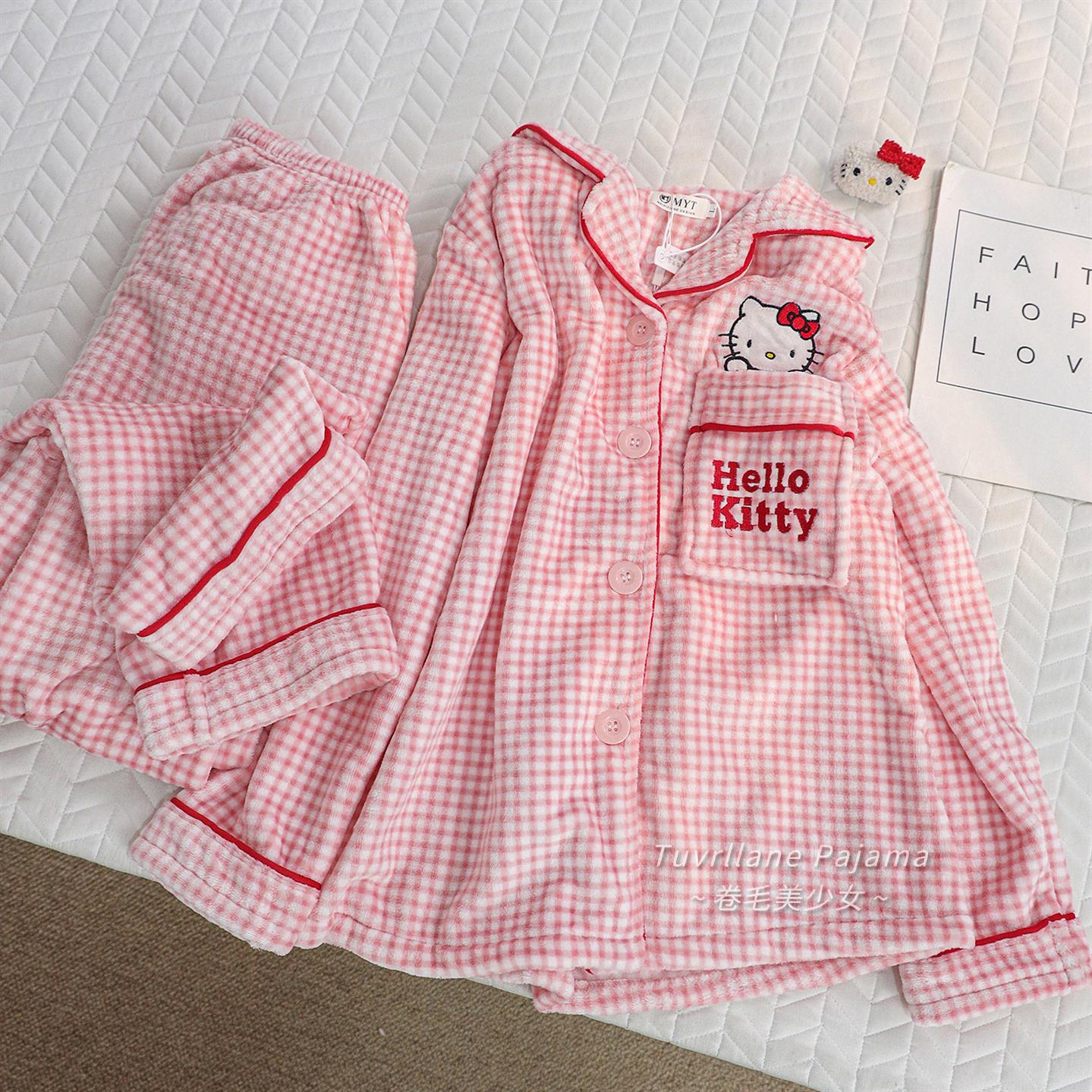 秋冬季加绒加厚保暖粉色格子珊瑚绒睡衣女可爱日系长袖家居服套装