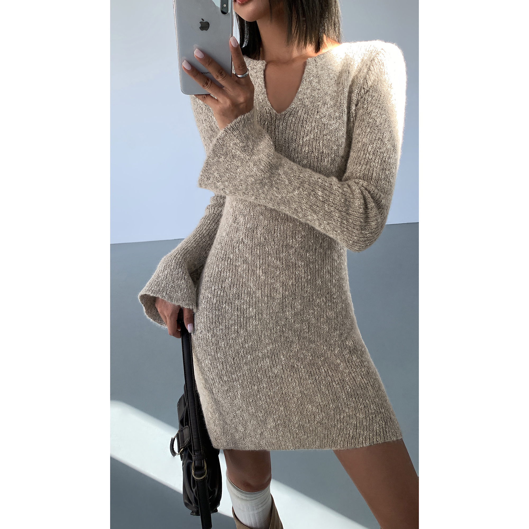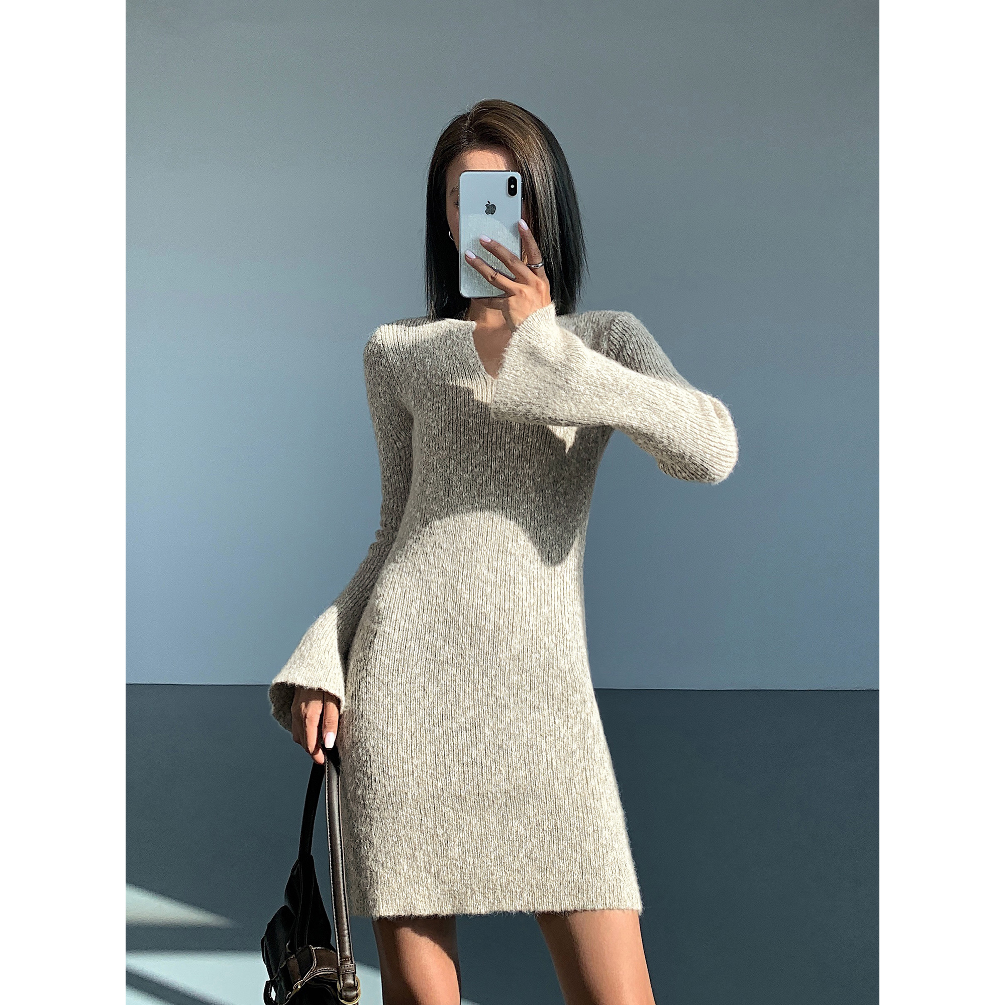 ousph 灰色小V领喇叭长袖连衣裙女2024冬收腰显瘦纯欲性感短裙潮