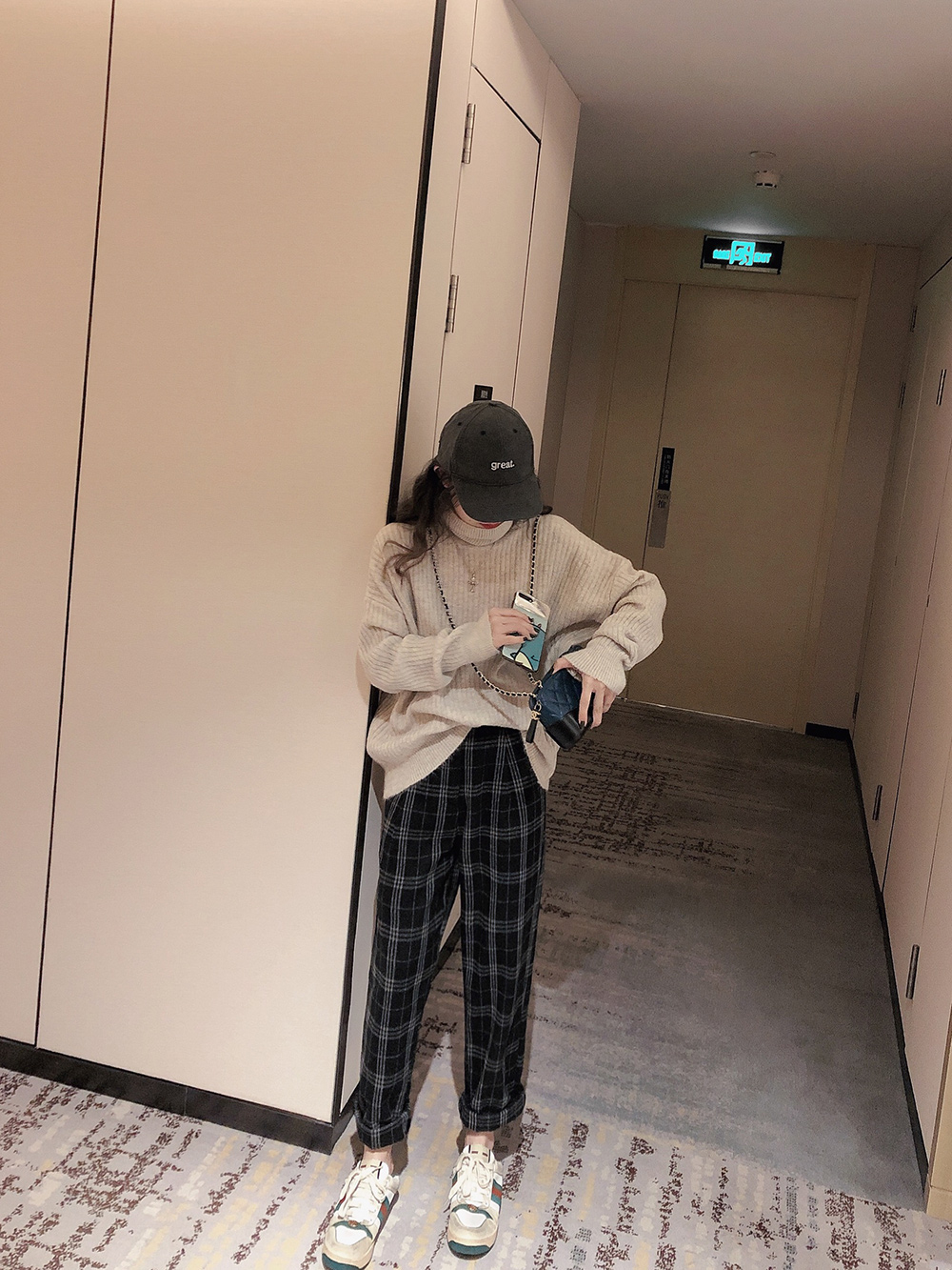 yukiss 秋冬加厚格子裤毛呢裤哈伦裤休闲裤直筒裤宽松复古裤子女