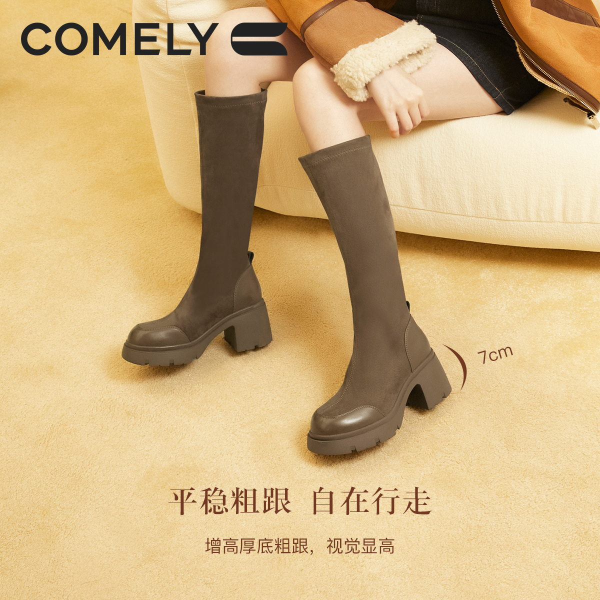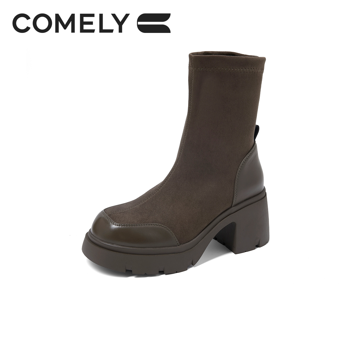 康莉弹力瘦瘦靴女秋冬拼接厚底粗跟百搭短靴袜靴单靴女靴骑士长靴