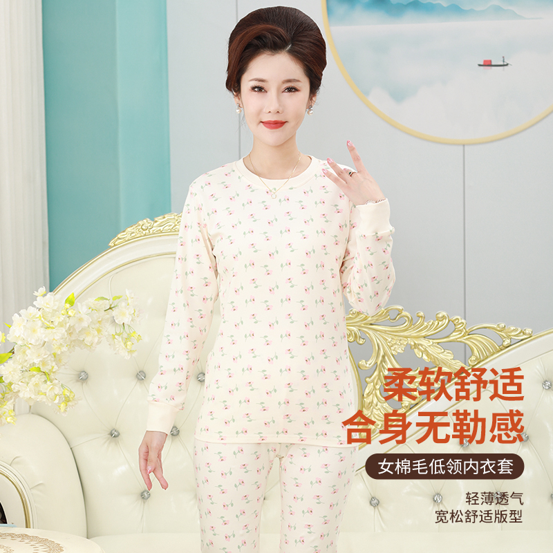 女士棉毛衫保暖套装中老年人纯棉100%低领秋衣秋裤妈妈打底衫