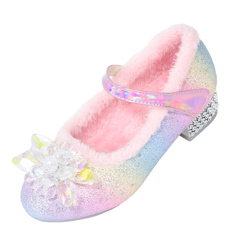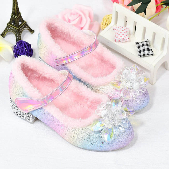 女童公主鞋秋冬季加绒高跟水晶鞋女孩软底保暖棉鞋儿童彩色小皮鞋