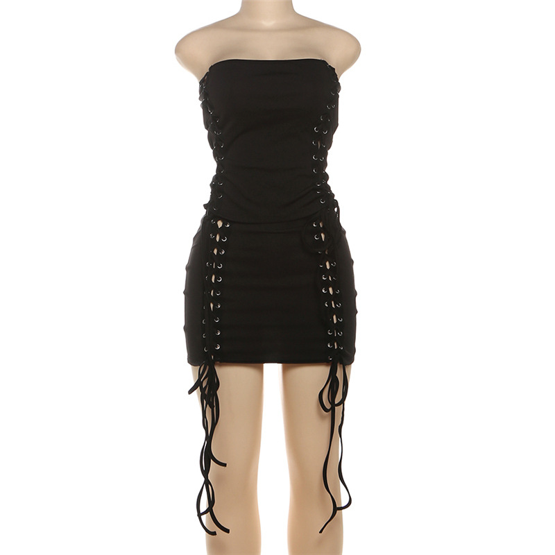 欧美秋冬跳舞酷炫超模时尚性感抹胸露背纯色交叉绑带短裙两件套装