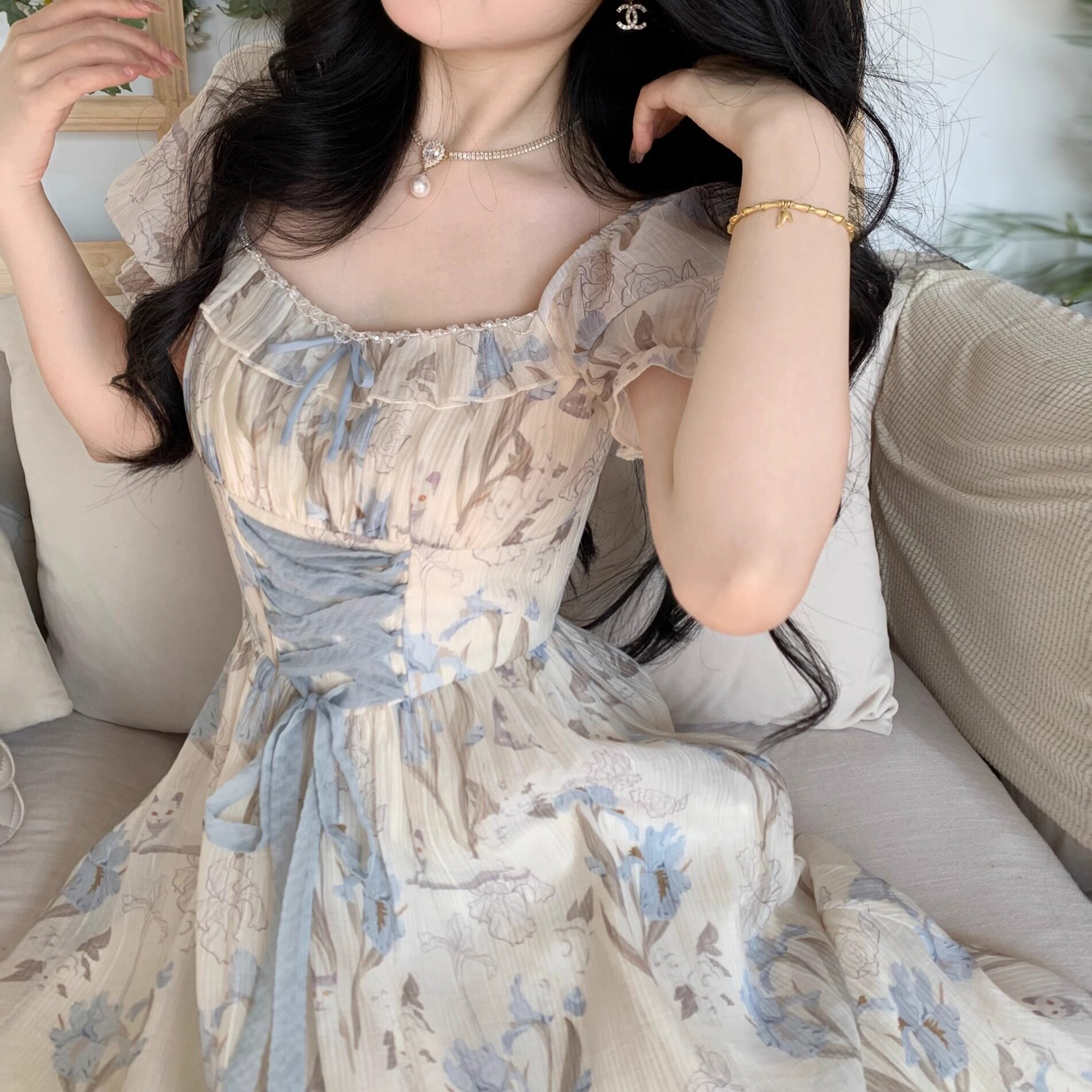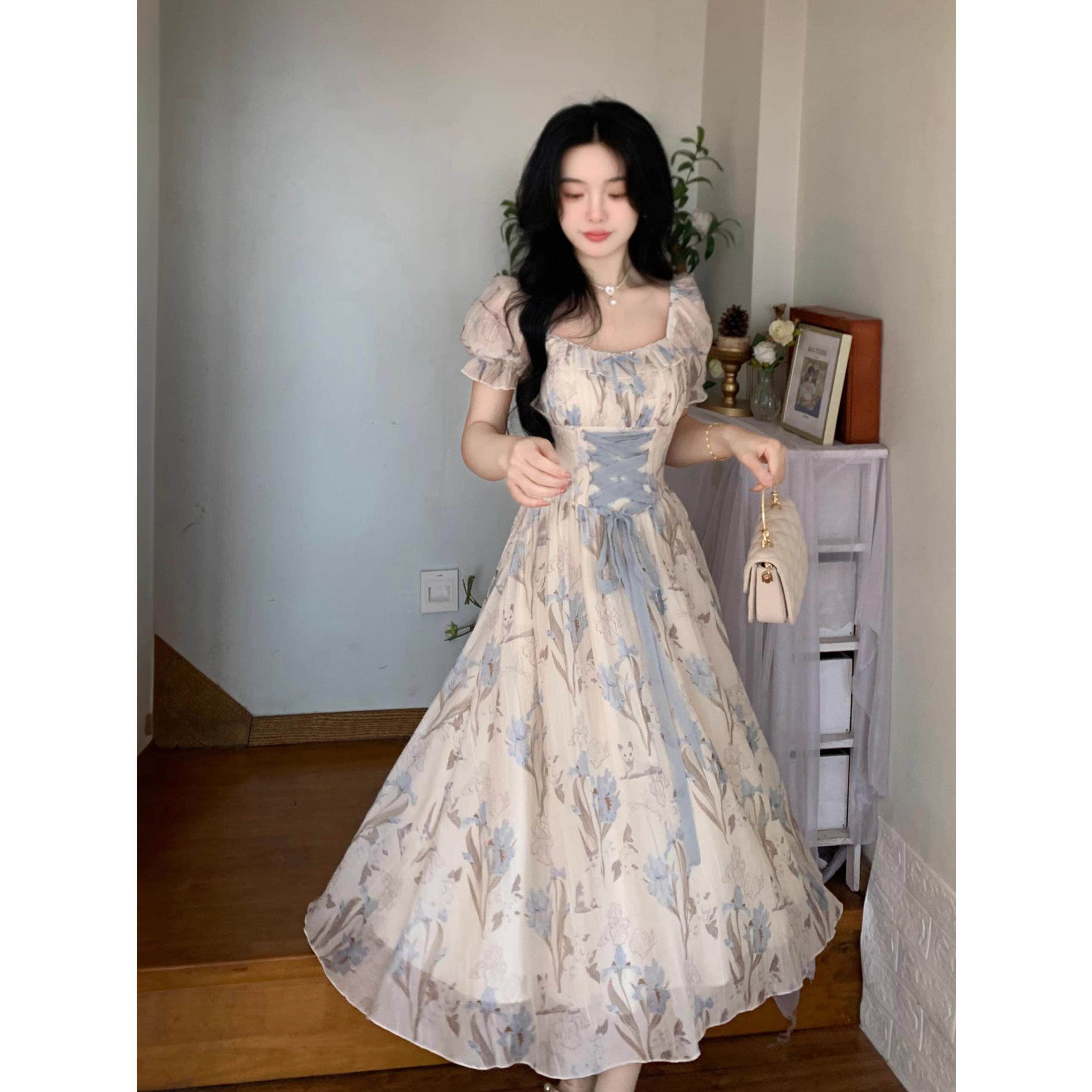 梦境鸢尾浪漫气质系带收腰方领长款连衣裙2026夏季收腰显瘦裙子
