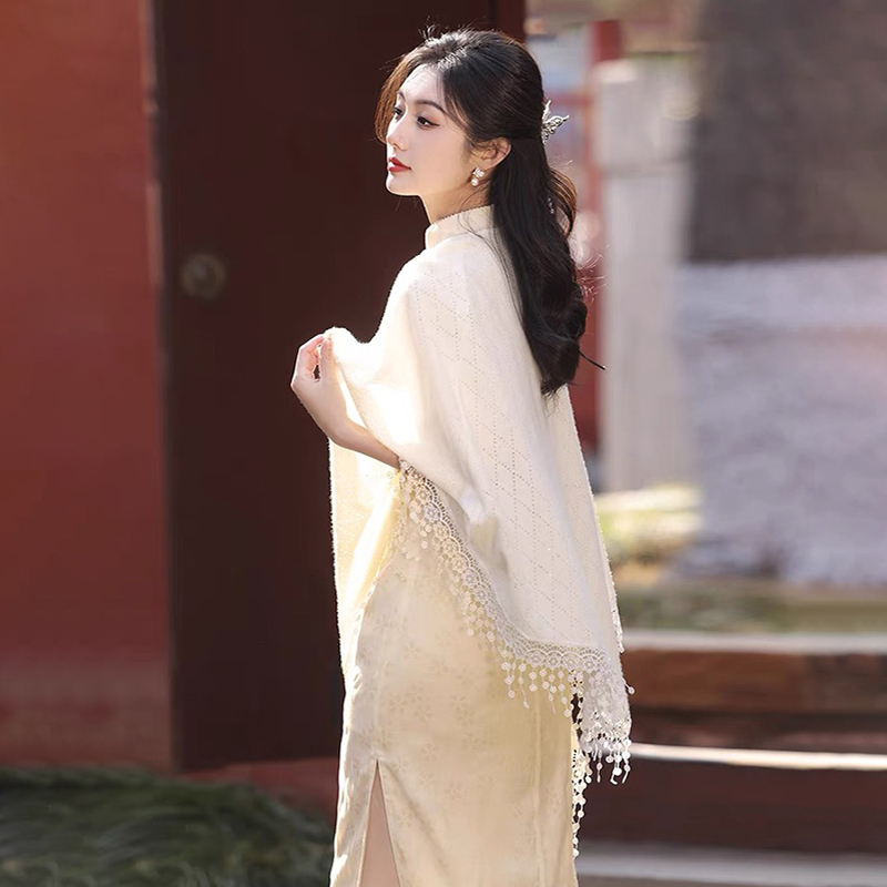 民国风旗袍外搭披肩女2025新款文艺薄款针织流苏开衫百搭显瘦围巾