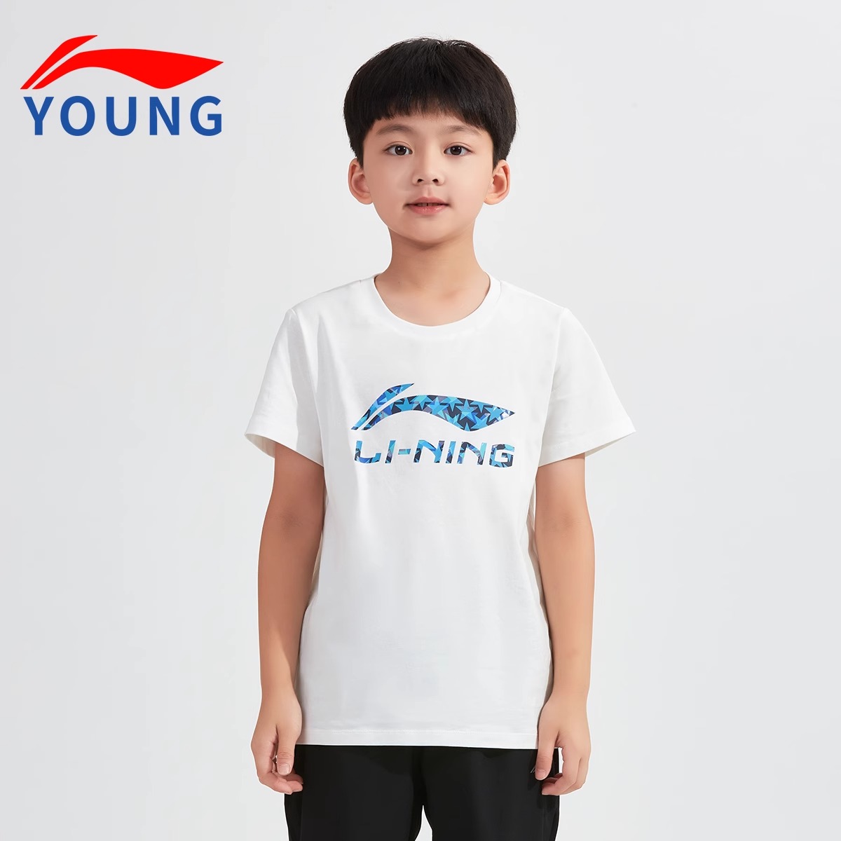 李宁短袖儿童T恤夏季新款男中大童纯棉半袖男童白色休闲运动上衣