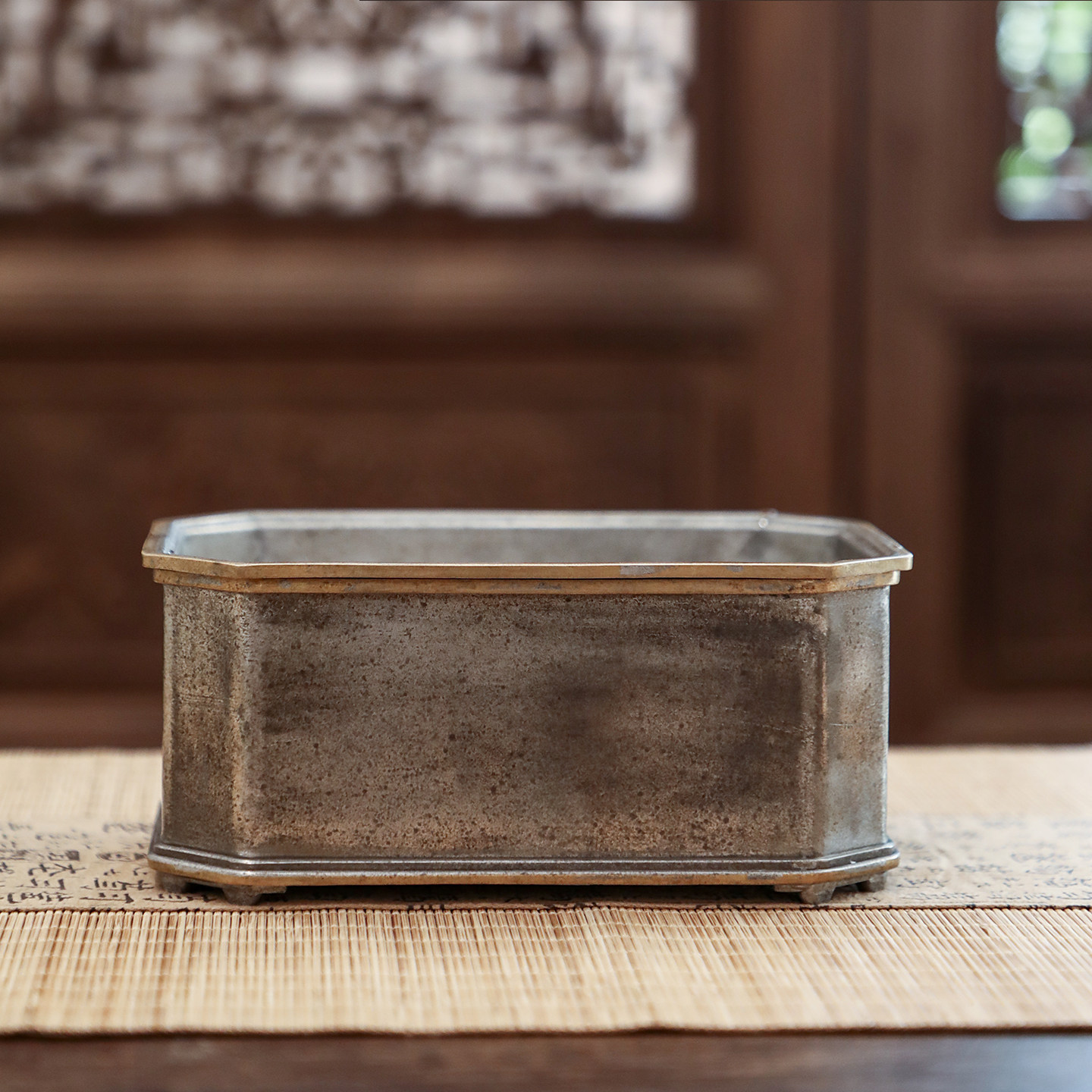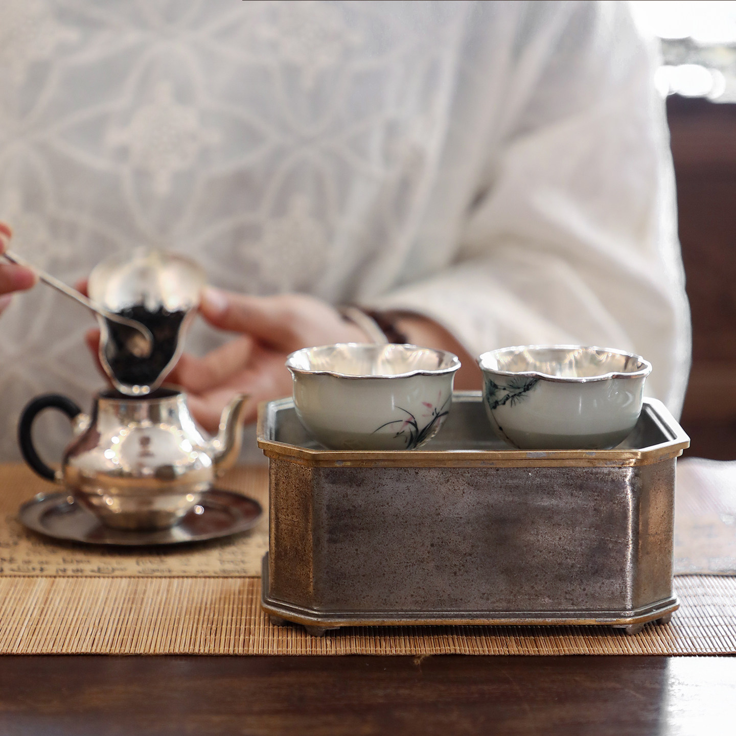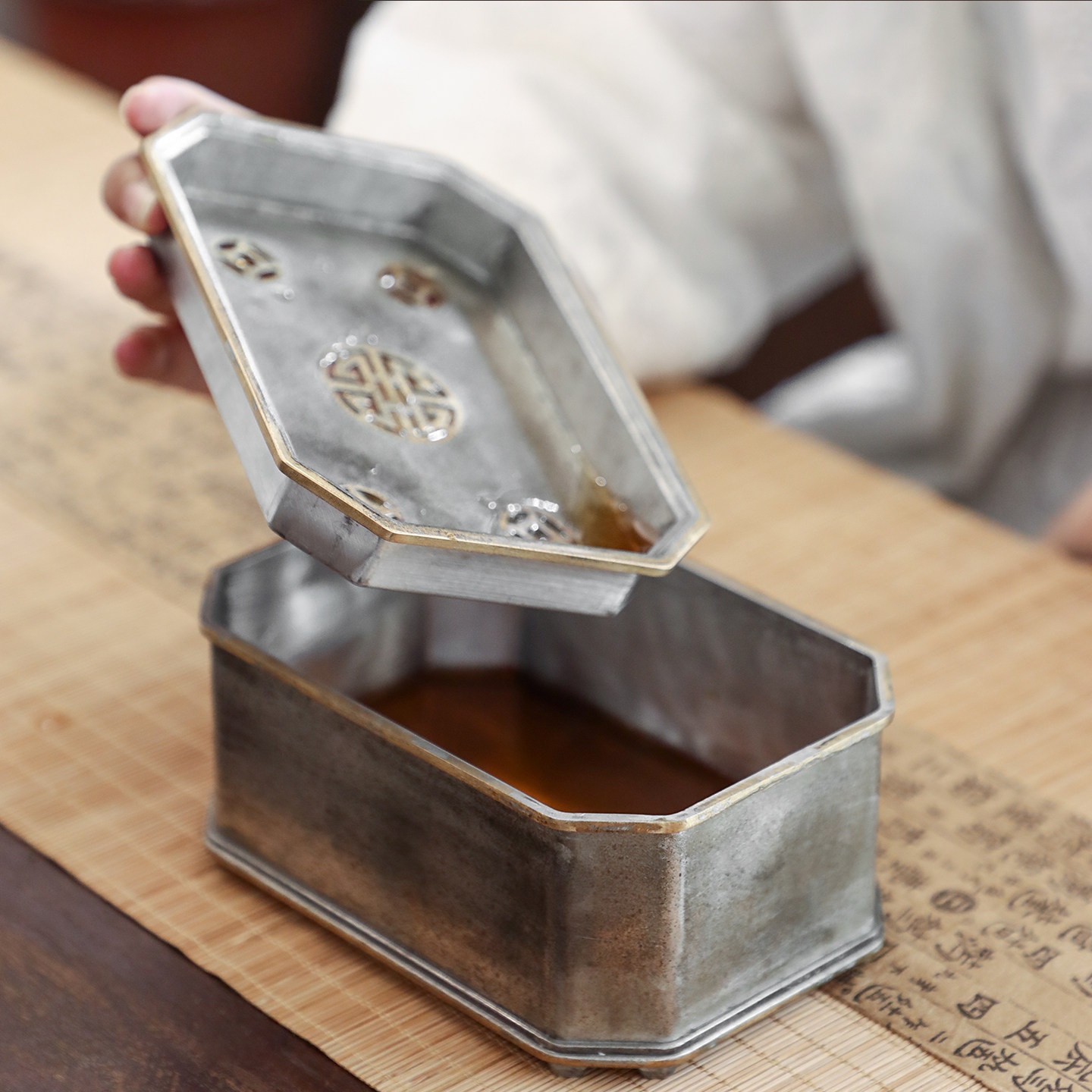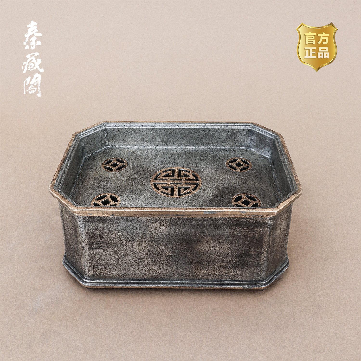 秦藏阁 寿纹做旧纯锡壶承手工镶铜茶盘做旧中式复古家用建水600ml