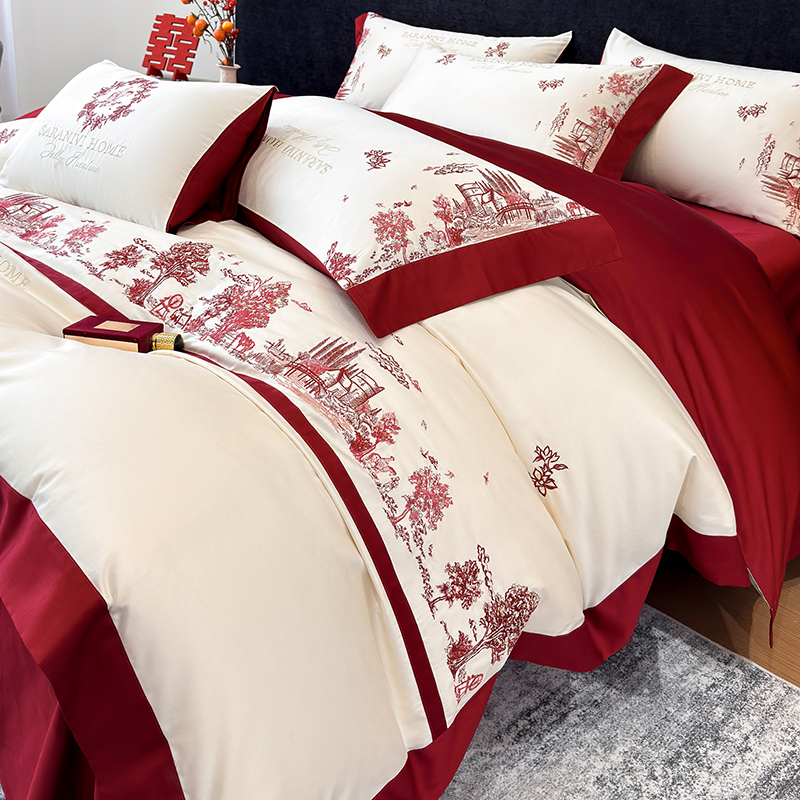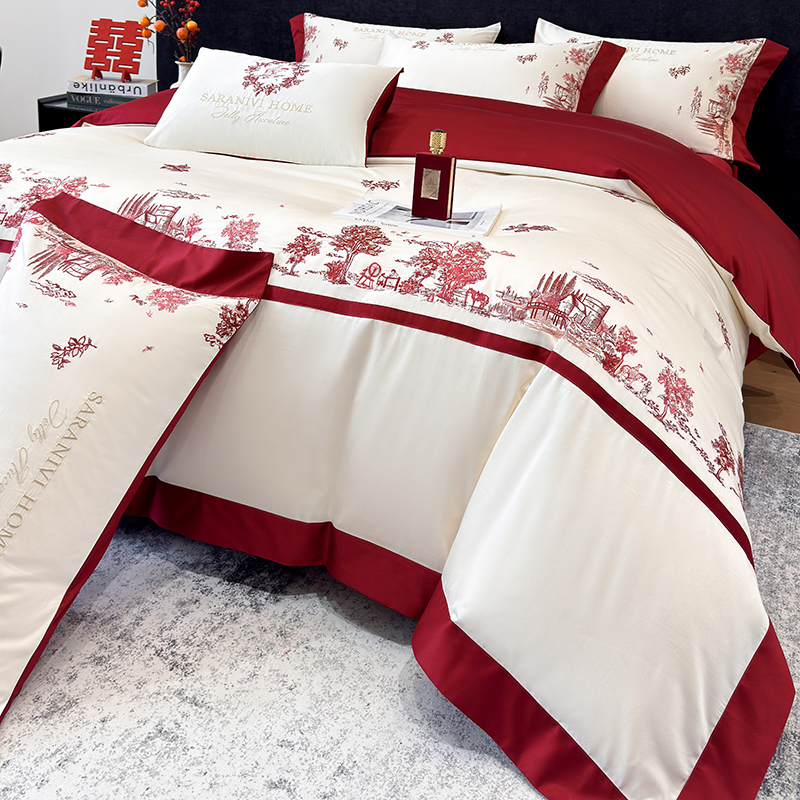 A类长绒棉全棉结婚四件套红色新婚陪嫁喜被套纯棉婚庆婚床上用品4