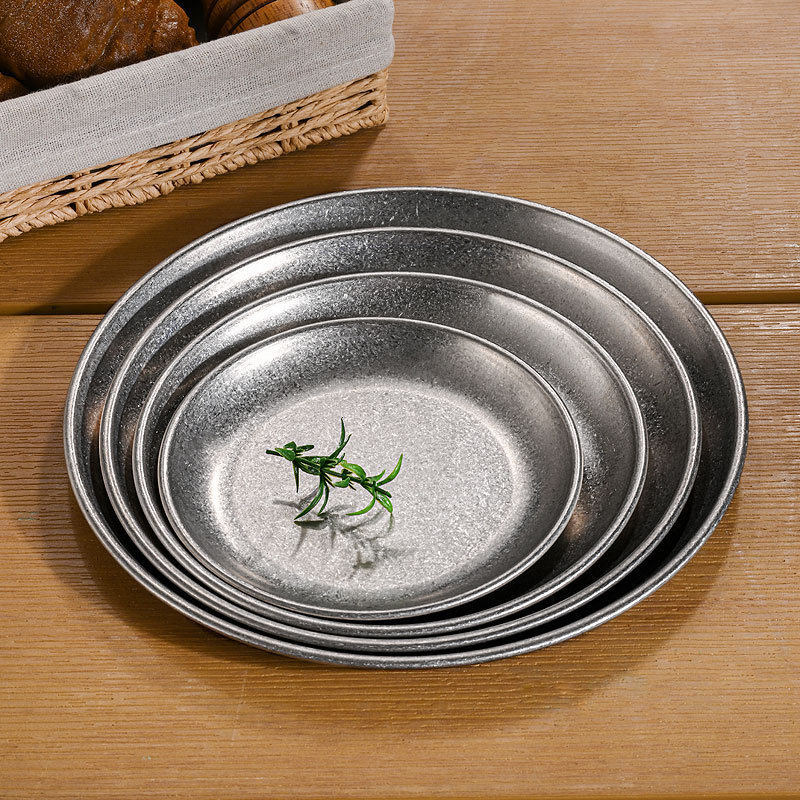 韩式不锈钢圆盘in做旧咖啡厅托盘水果盘甜品浅盘平底碟复古餐具
