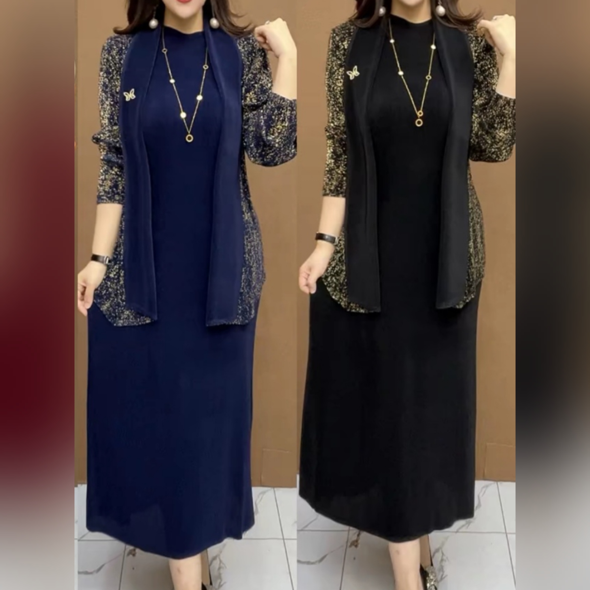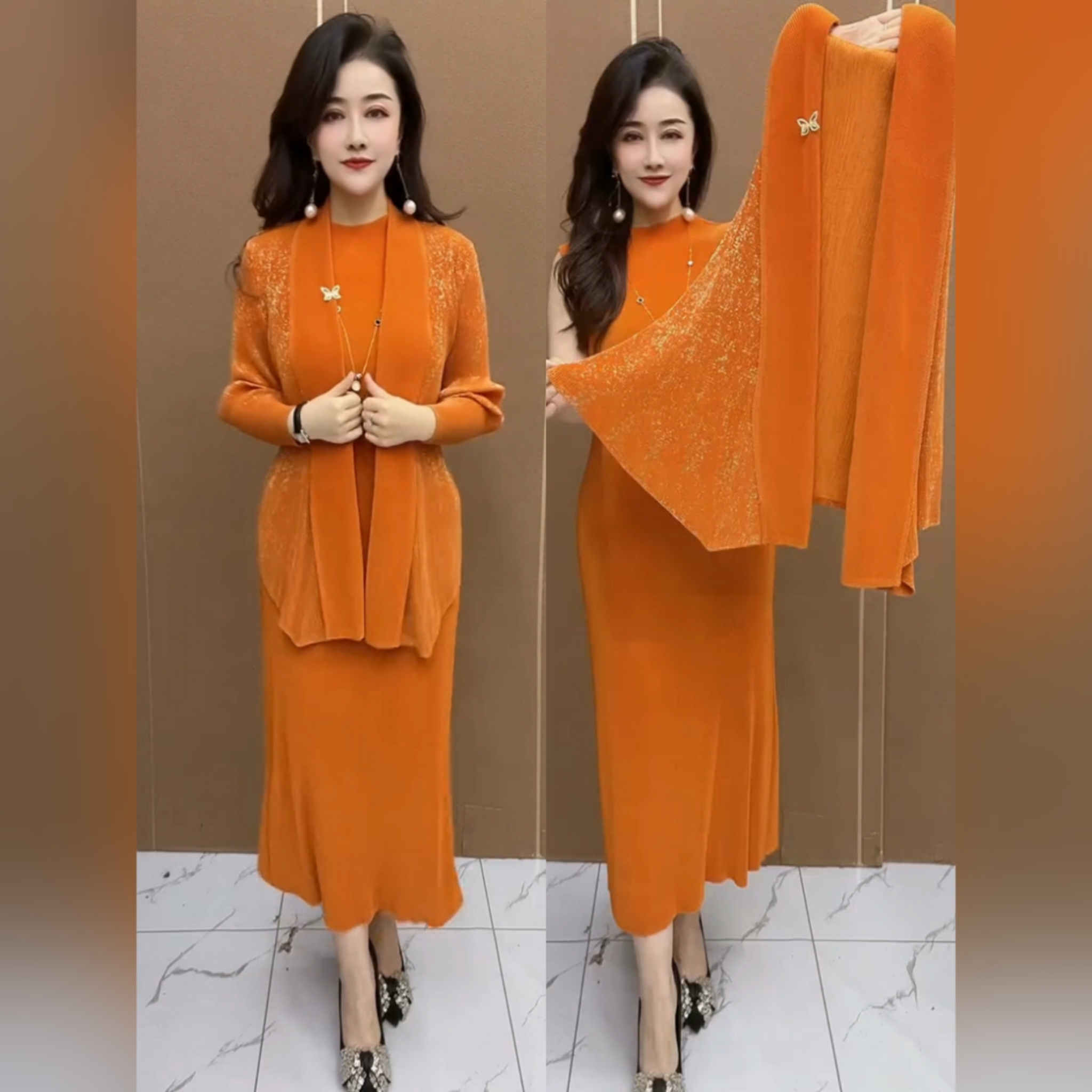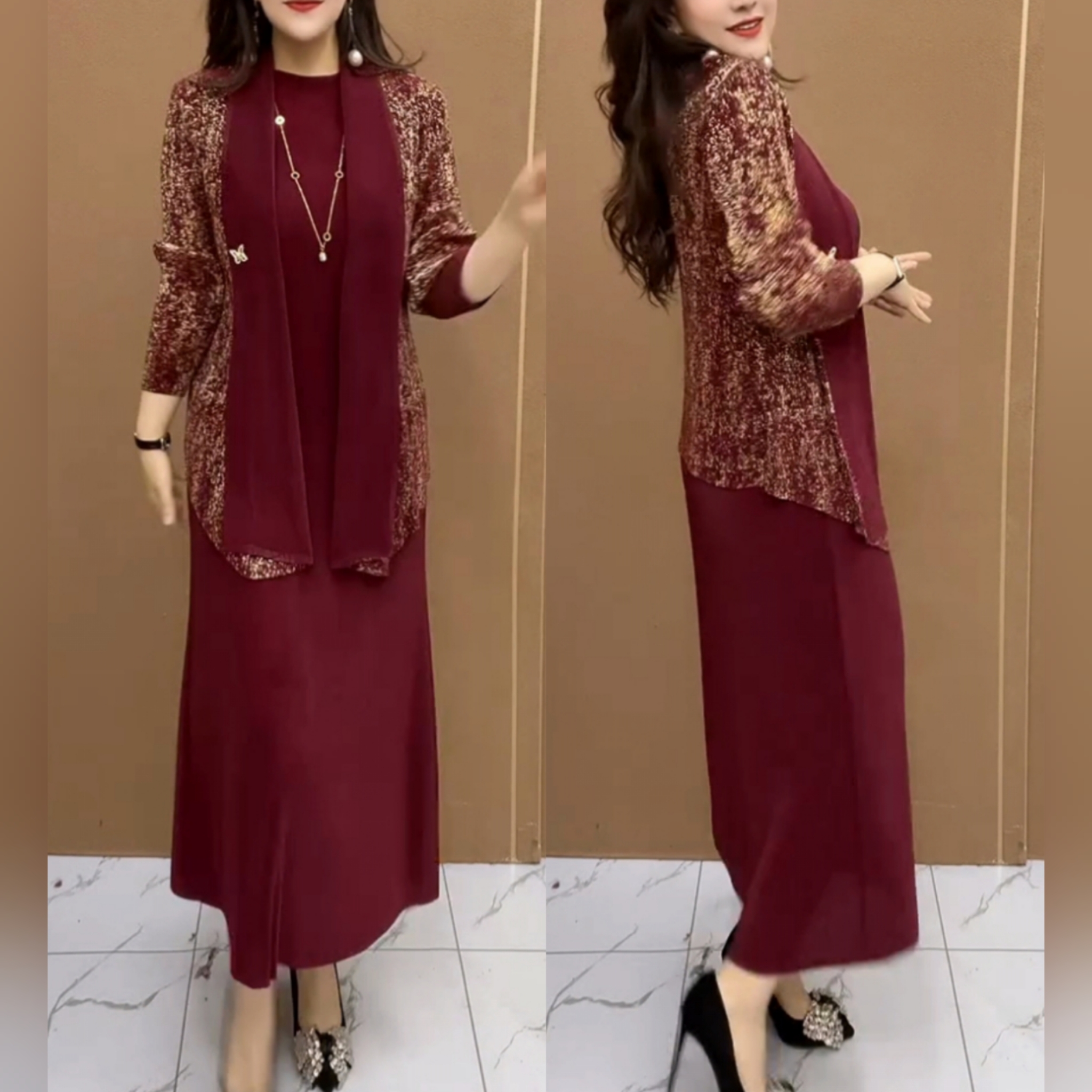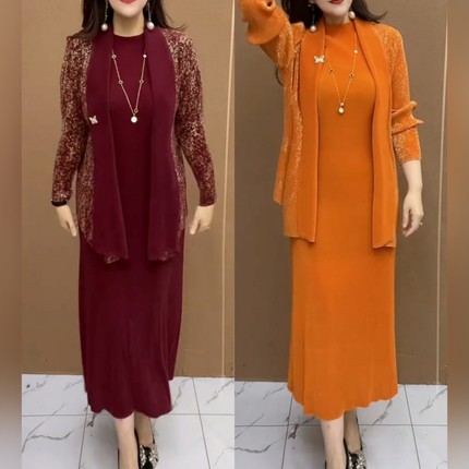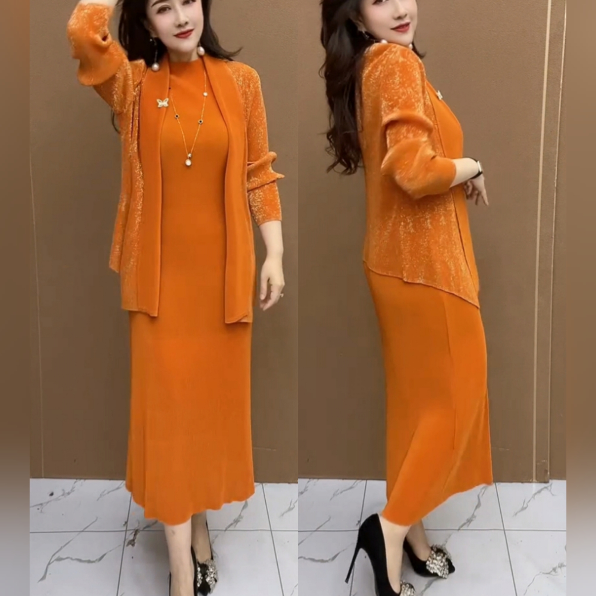 妈妈气质褶皱套装秋款小香风印花外套内搭气质减龄连衣裙两件套薄