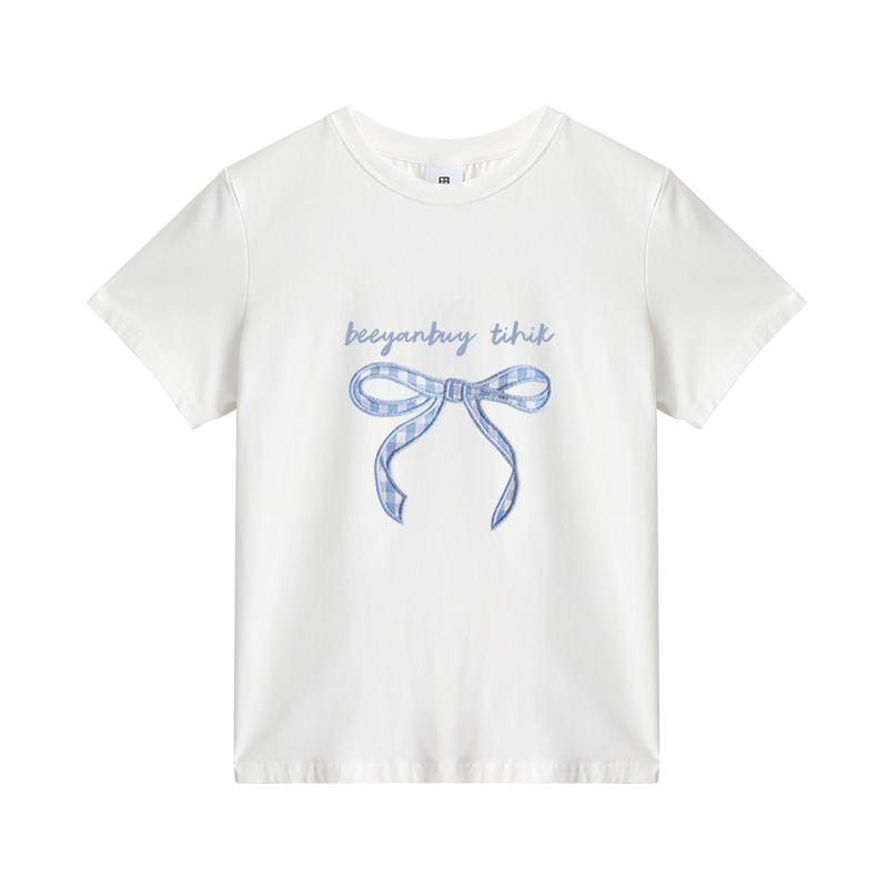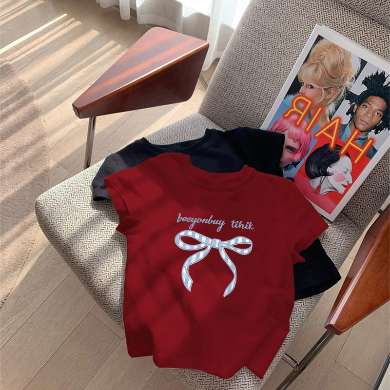 女童装正肩短袖t恤纯棉夏装2025新款圆领百搭蝴蝶结印花儿童上衣