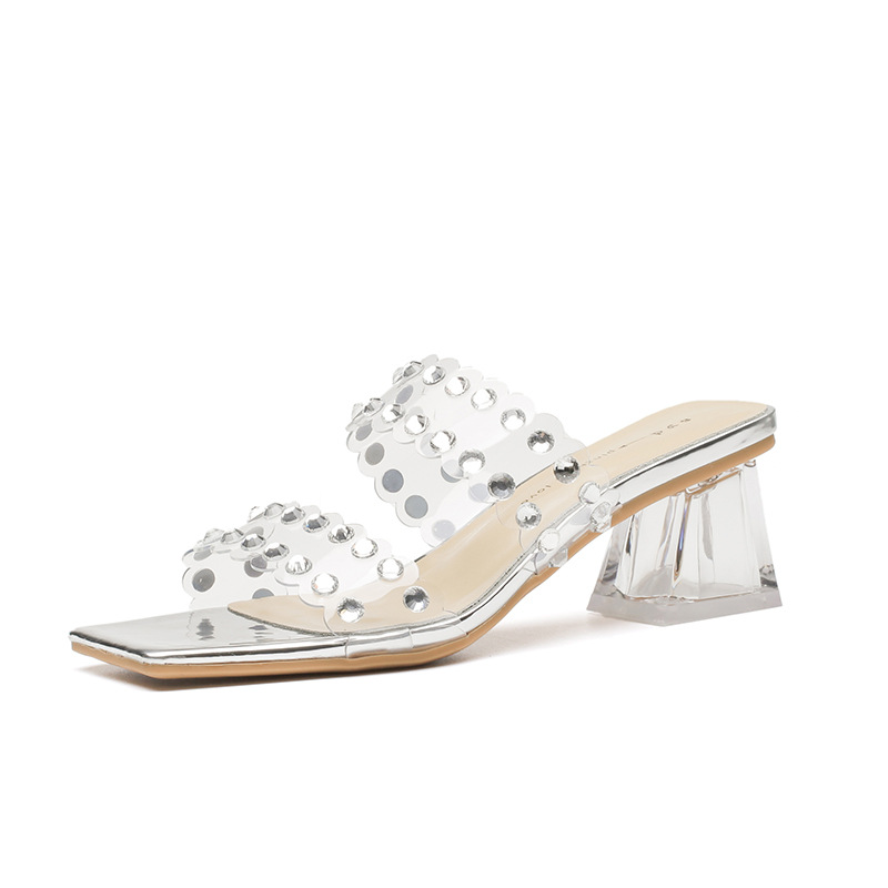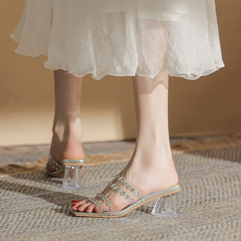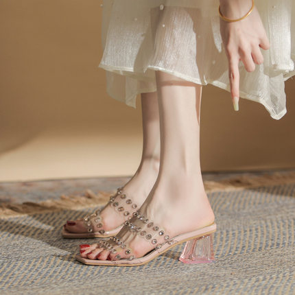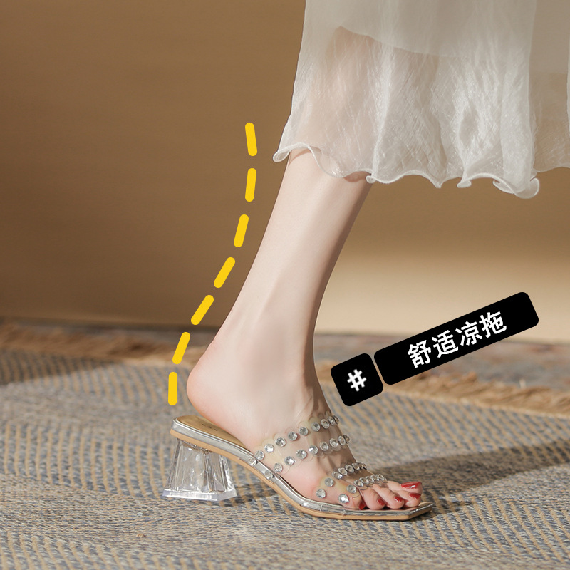 夏季新款高跟拖鞋透明带凉鞋女法式柳钉水晶粗跟高跟鞋女