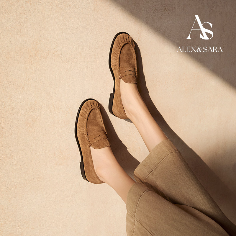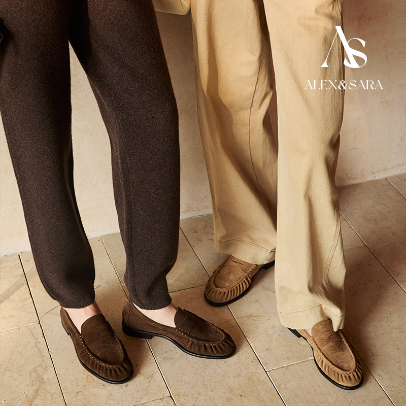 ALEXSARA 2026早春新款 圆头麂皮平底鞋超柔软褶皱乐福鞋平跟单鞋