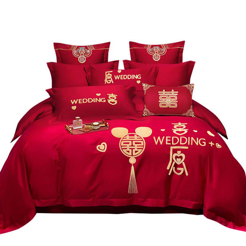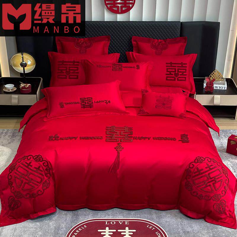 高端结婚喜庆四件套毛巾绣高级感红色被套床单新婚房婚庆陪嫁床品