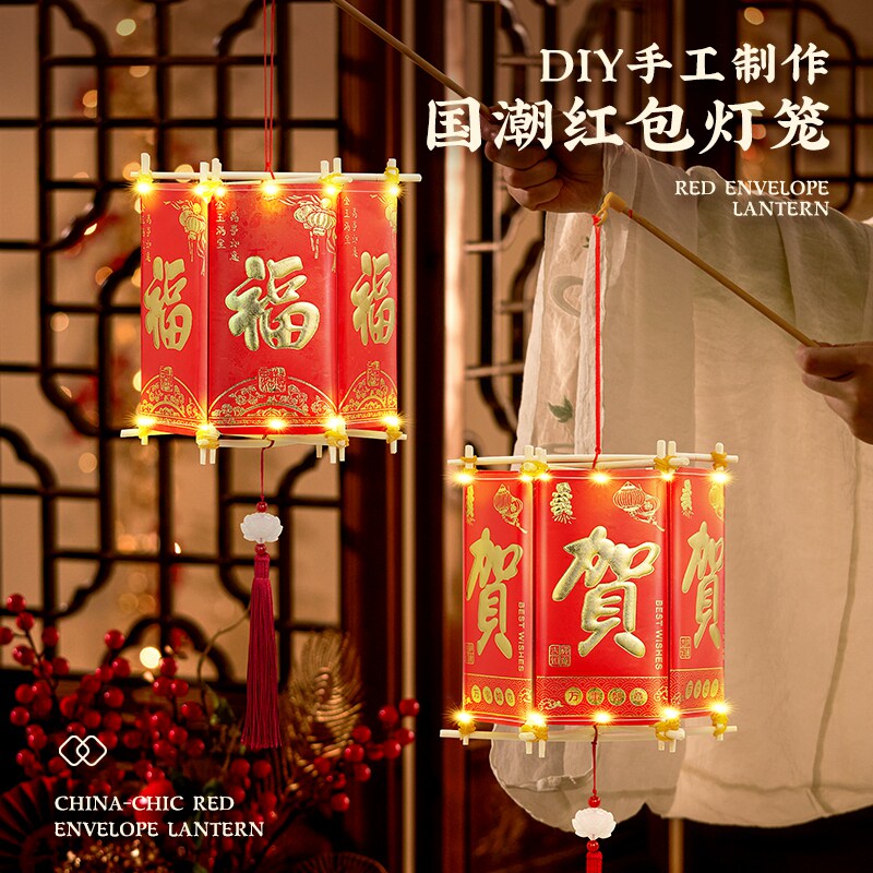 新年元宵红包灯笼2026新款儿童手工diy材料包发光手提式宫灯礼物