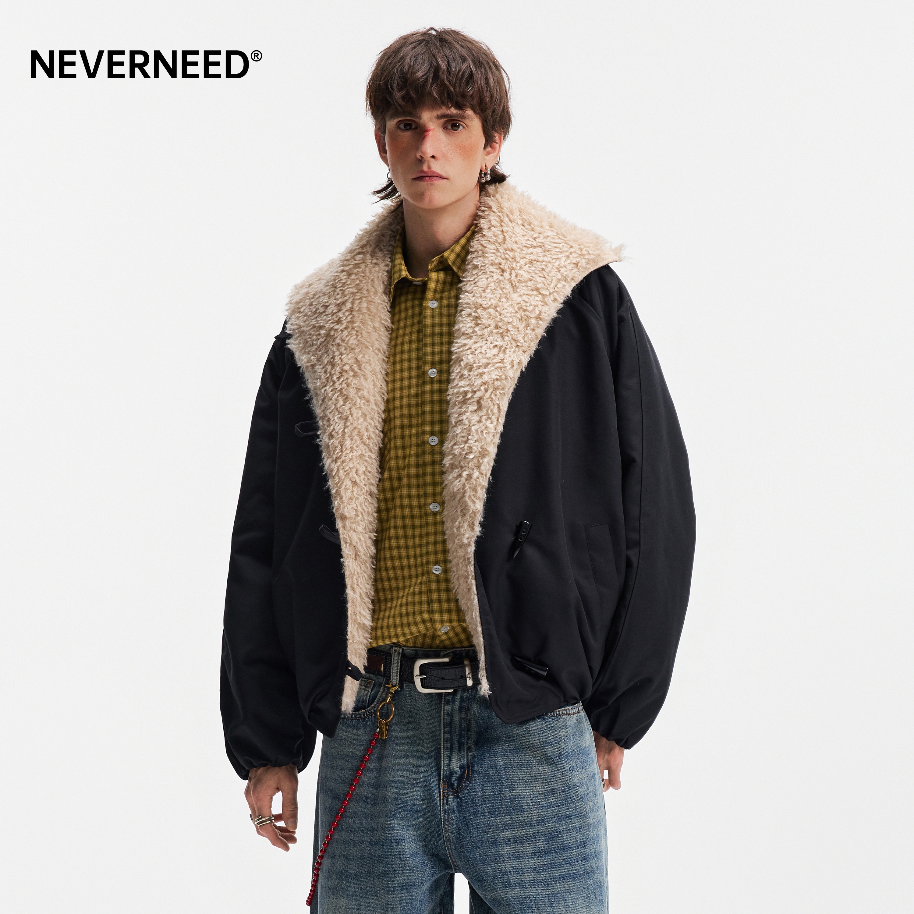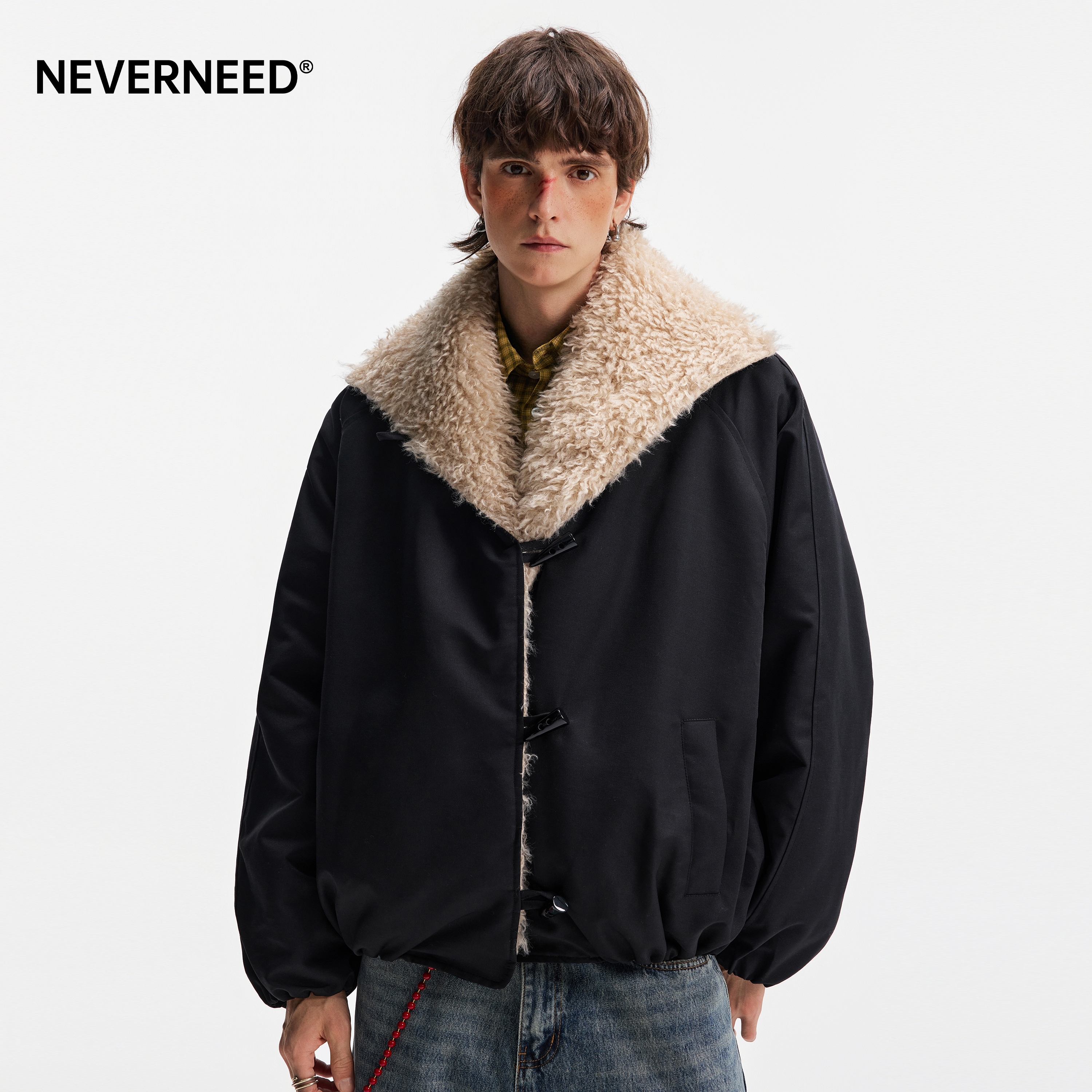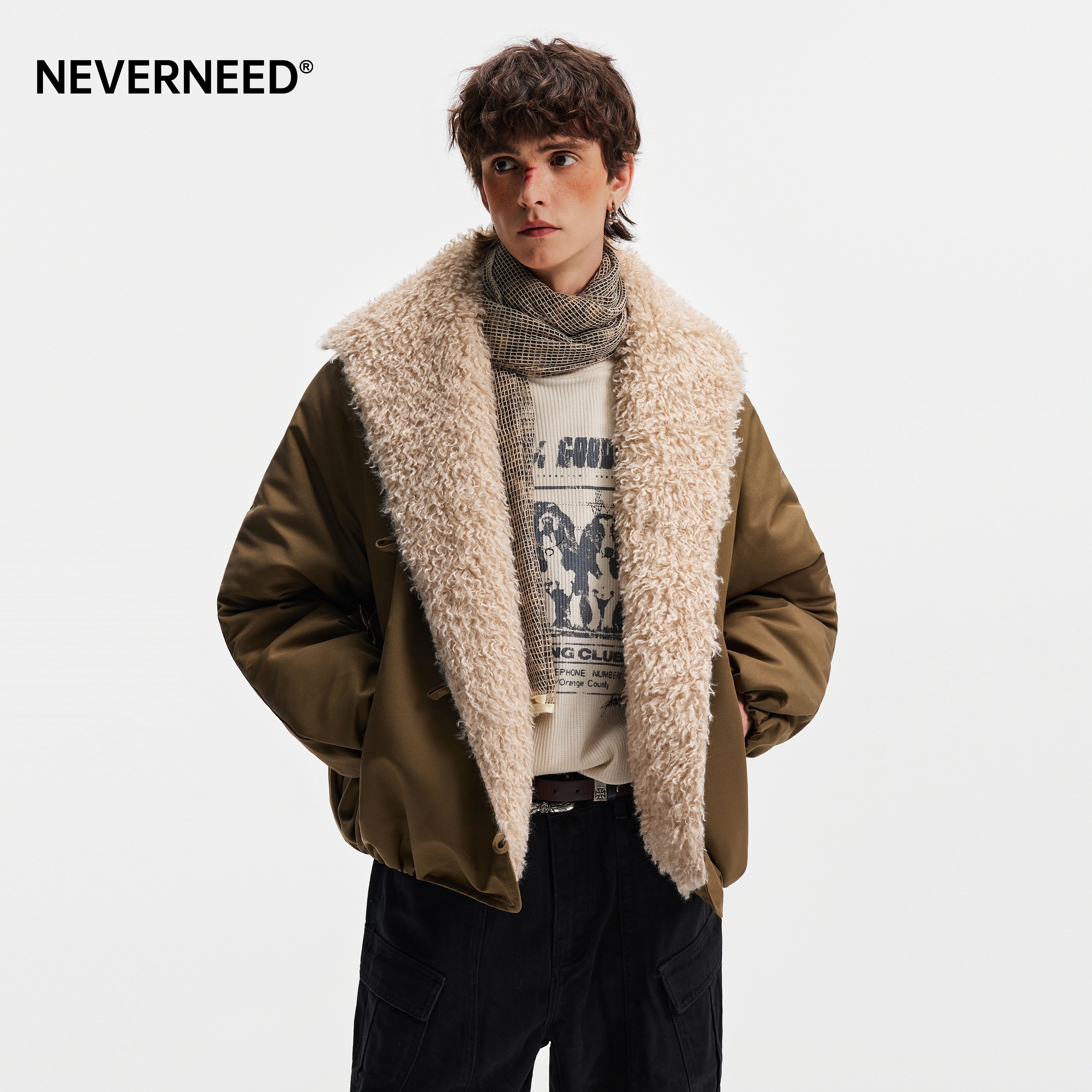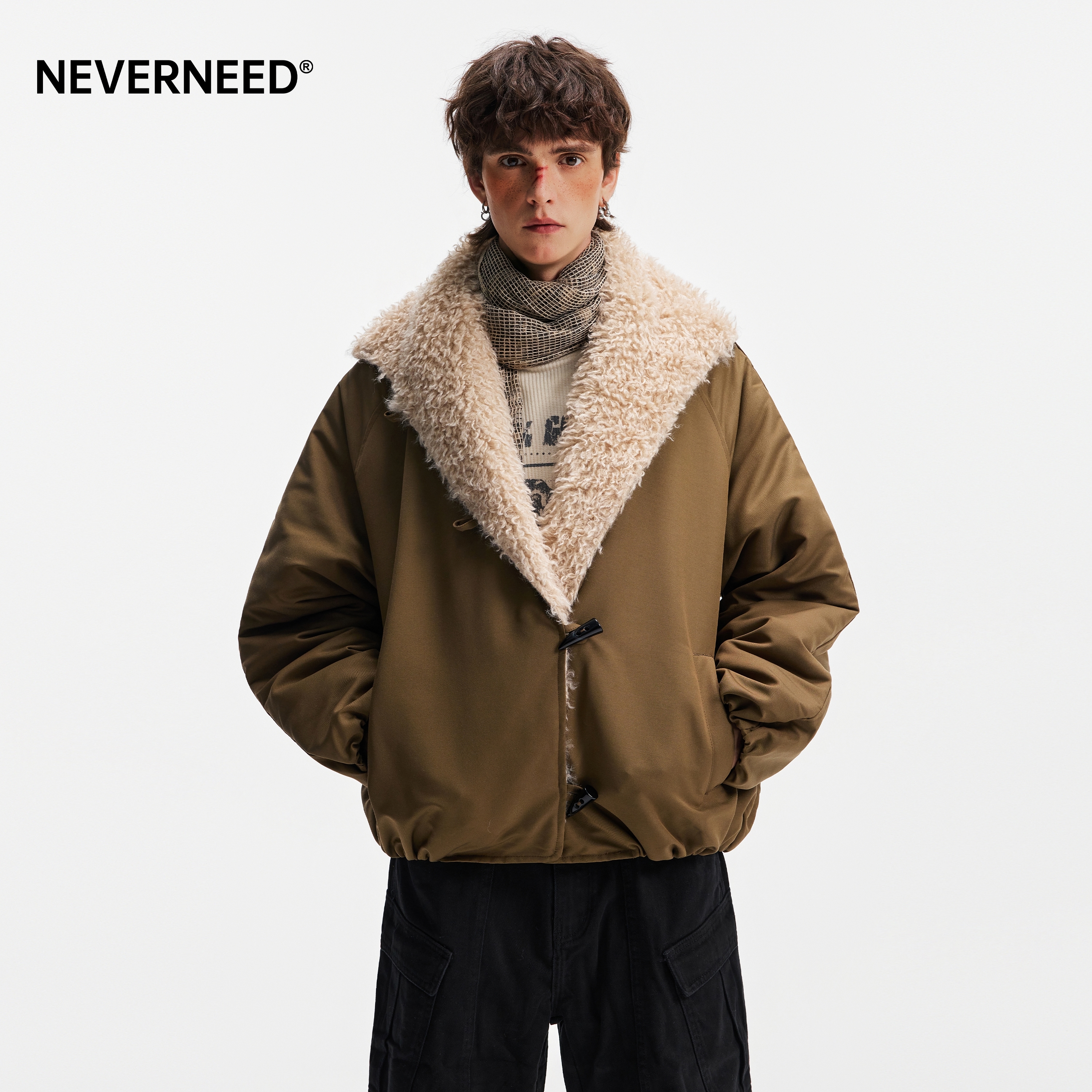 NEVERNEED羊羔毛牛角扣翻领棉衣男女秋冬季美式复古宽松休闲棉服