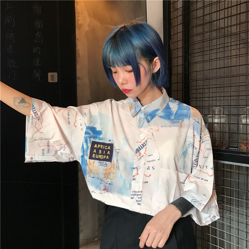 mapogo 原宿风复古航海图上衣街头嘻哈宽松印花短袖衬衫学生男女
