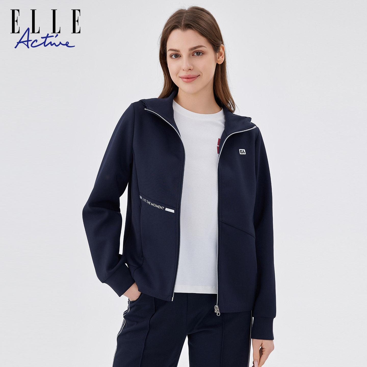 ELLE Active户外运动风粉色开襟卫衣外套女活力减龄连帽休闲夹克