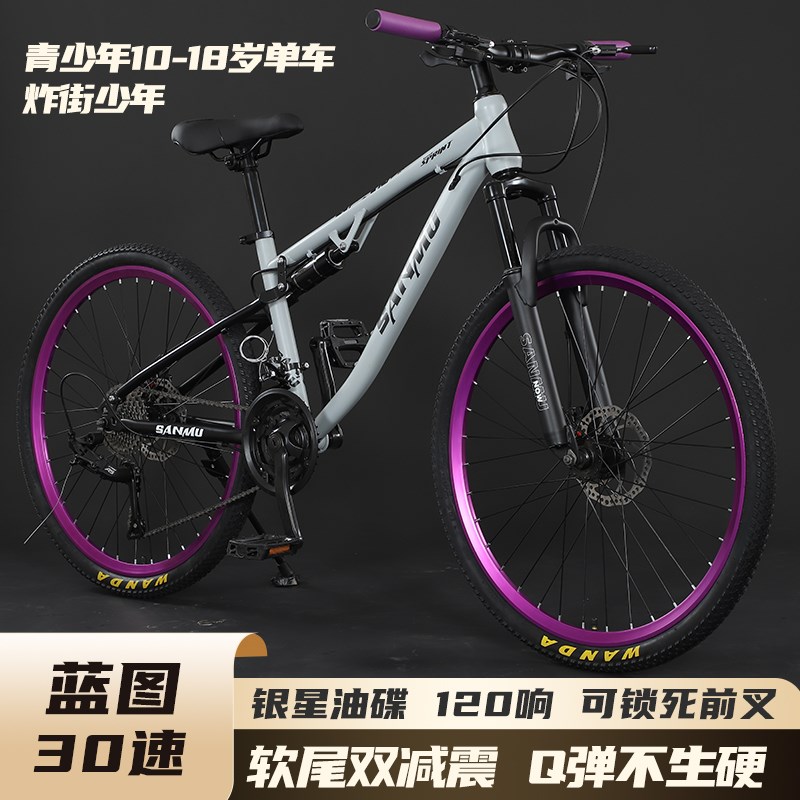 双减震软尾山地车越野学生变速男土坡自行车双碟刹青少年通勤单车