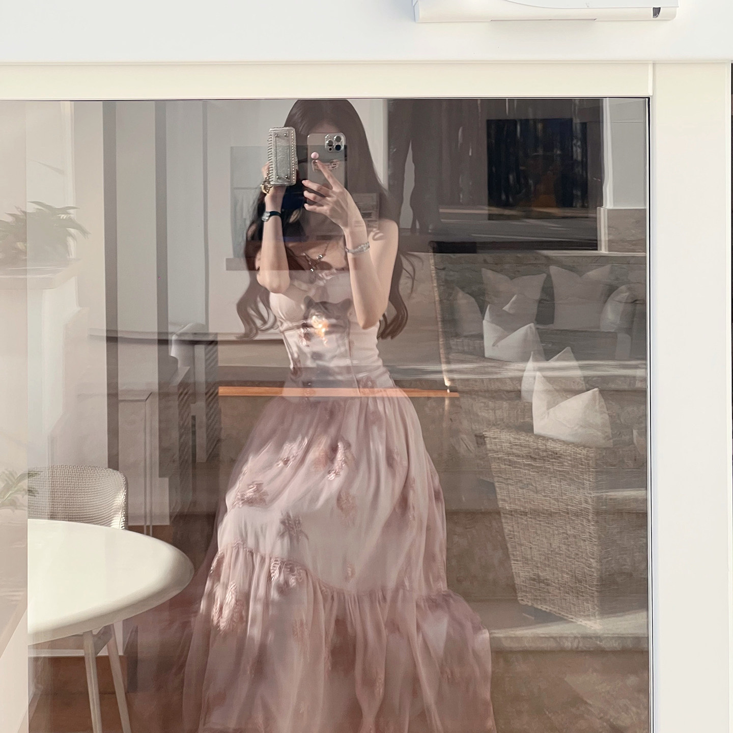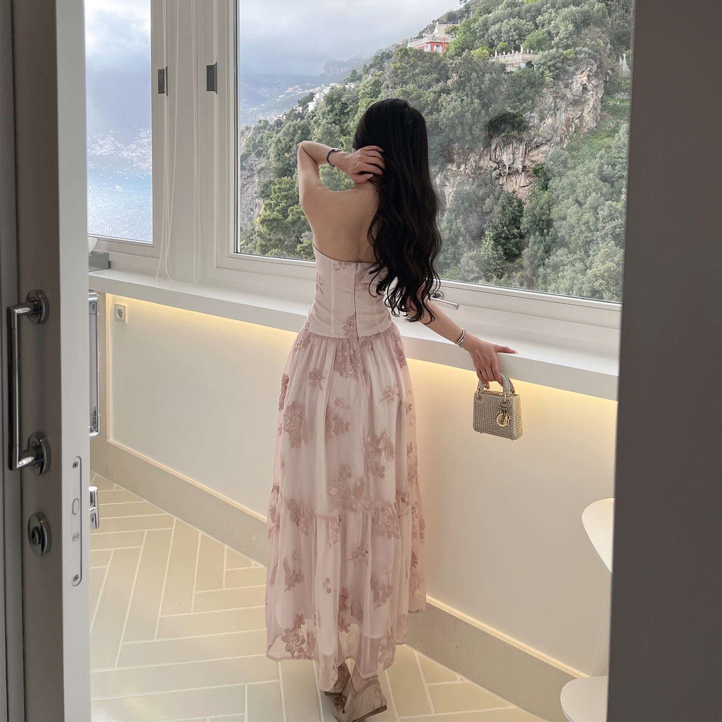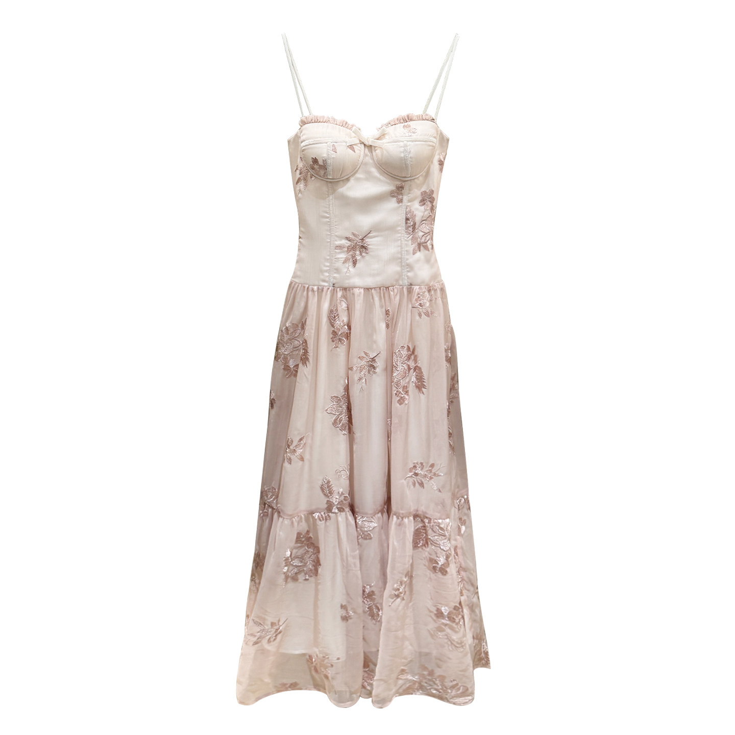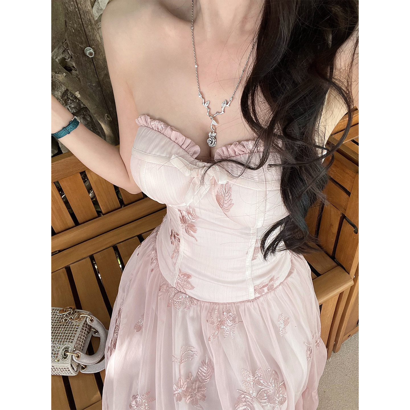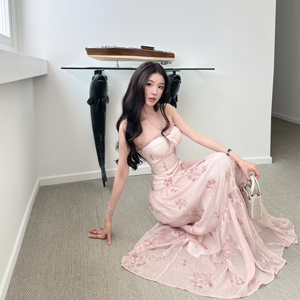 熊熊【花影霓裳】原创款防真丝绣花雪纺花边蝴蝶结抹胸吊带连衣裙
