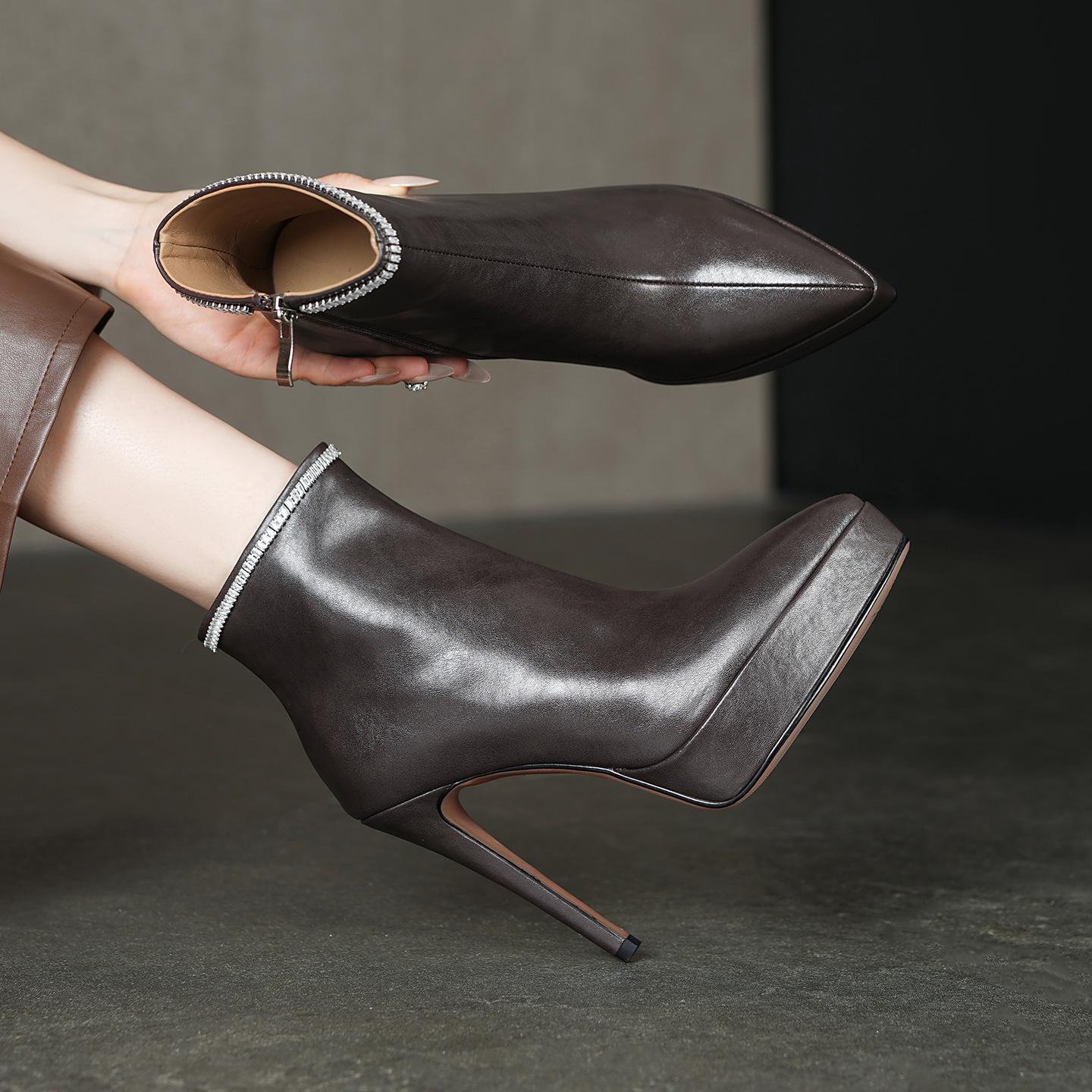 水钻领尖头细跟厚底防水台高跟鞋法式高级修面皮真皮短靴黑色百搭