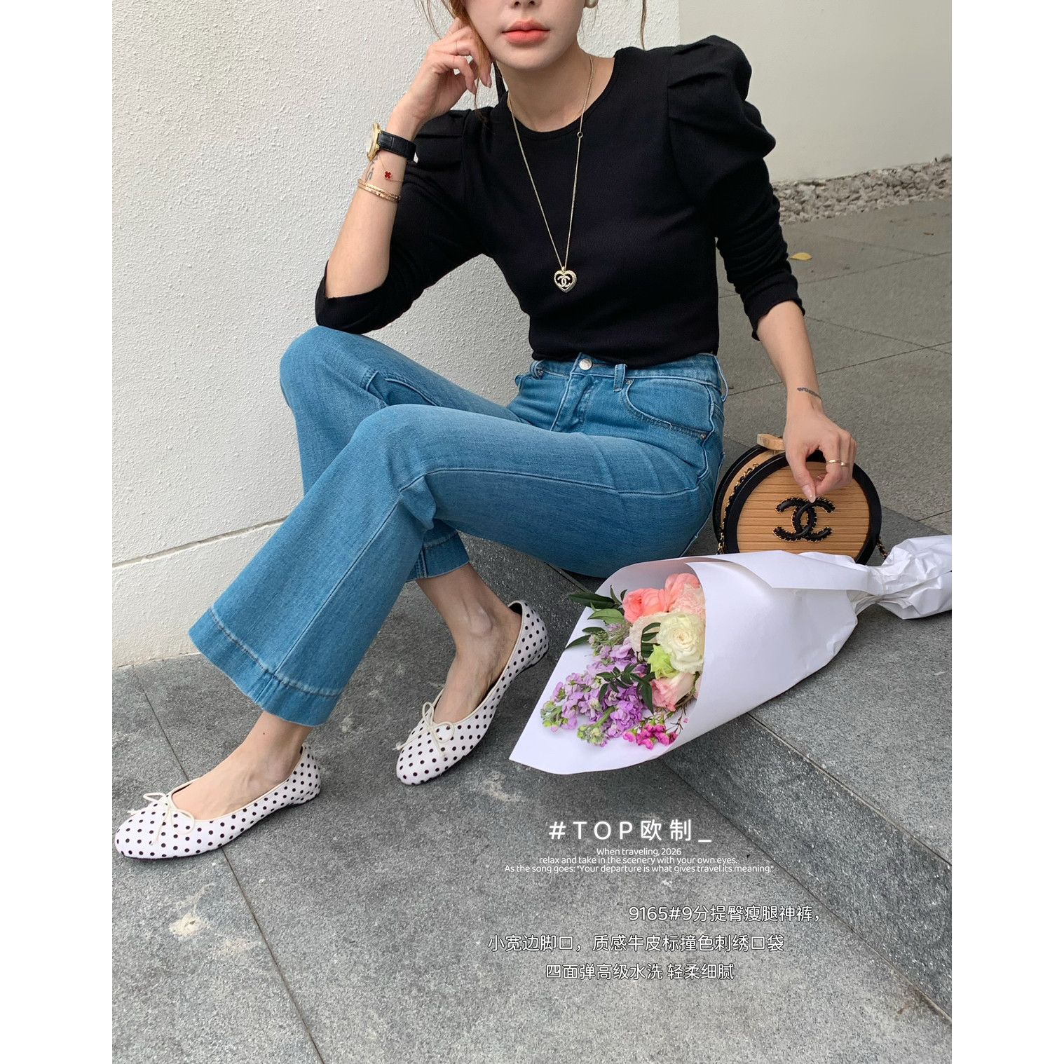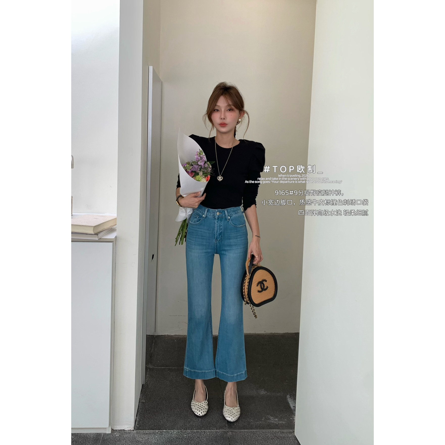 TOP 欧制-皮标撞色刺绣口袋四面弹9分微喇提臀瘦腿牛仔裤9165浅兰