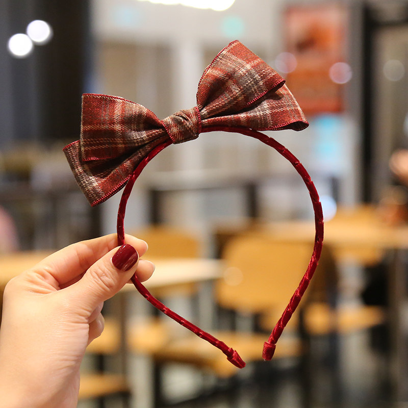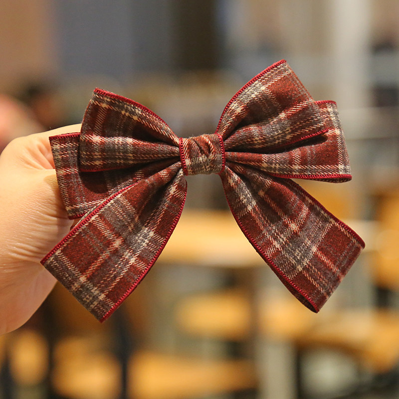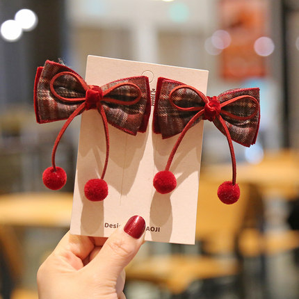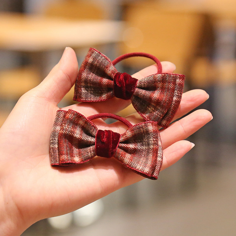 可爱小女孩发饰酒红色格子蝴蝶结新年发夹对夹儿童头绳发圈头饰