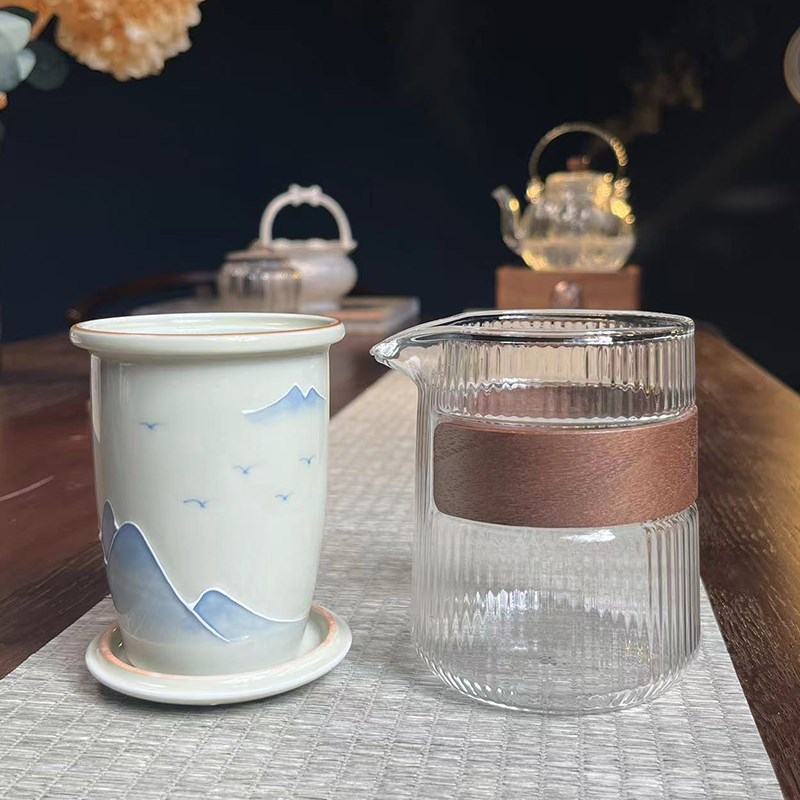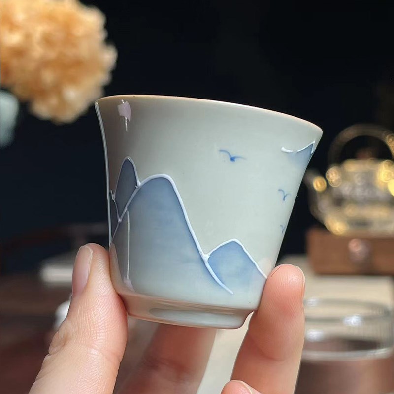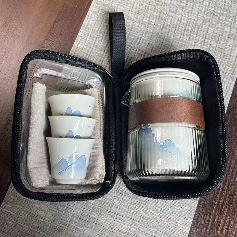手绘浮雕远山快客杯陶瓷旅行茶具一壶三杯户外便携式茶杯套装