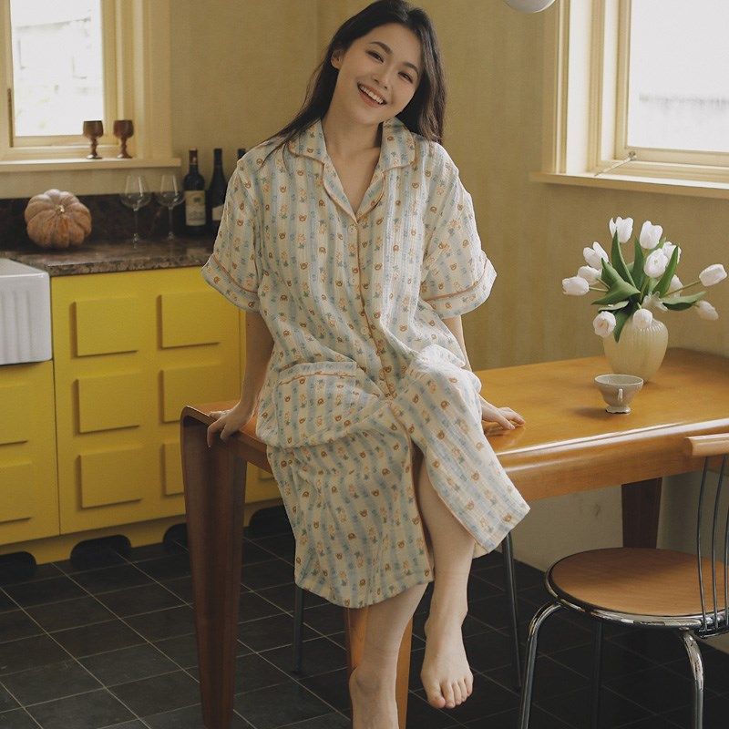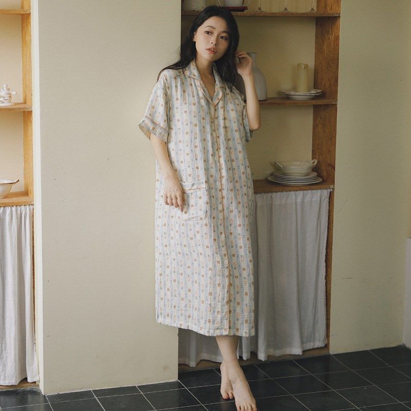 纯棉皱布孕妇哺乳长睡裙纱布夏季短袖碎花月子服产妇待产检连衣裙