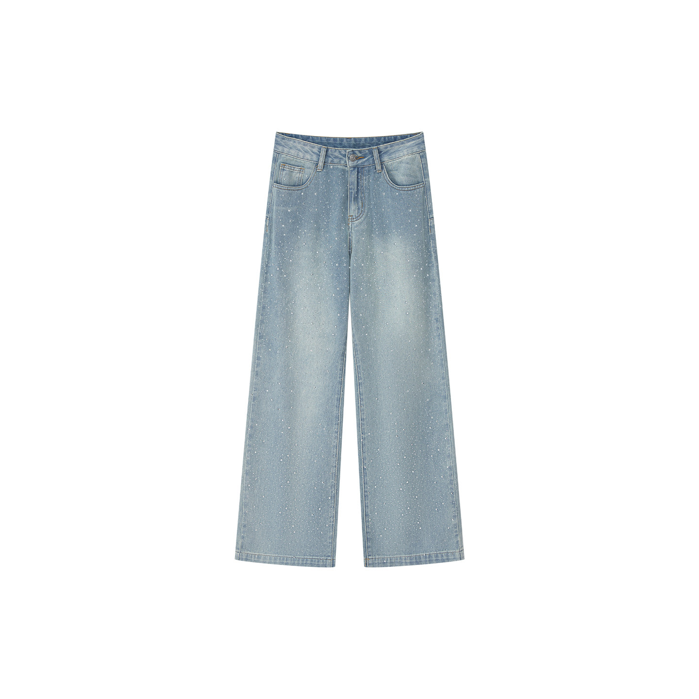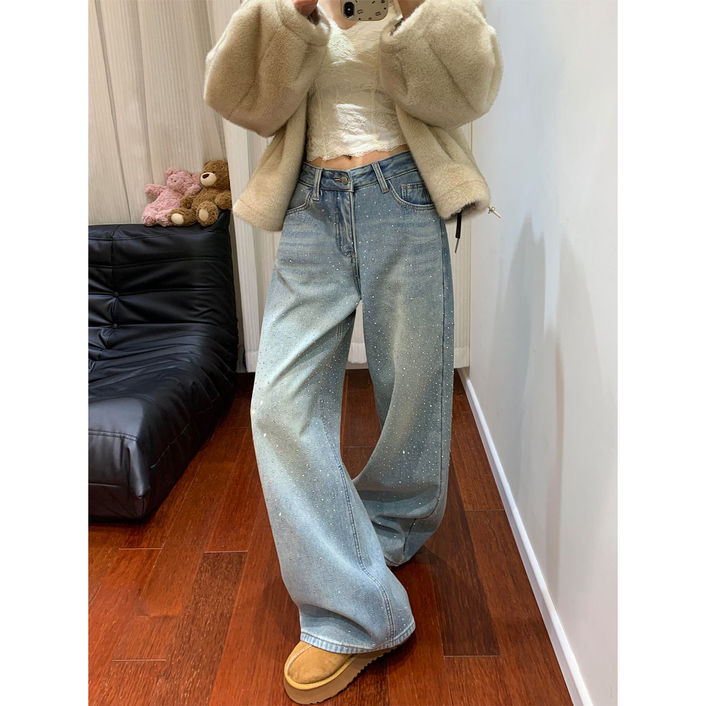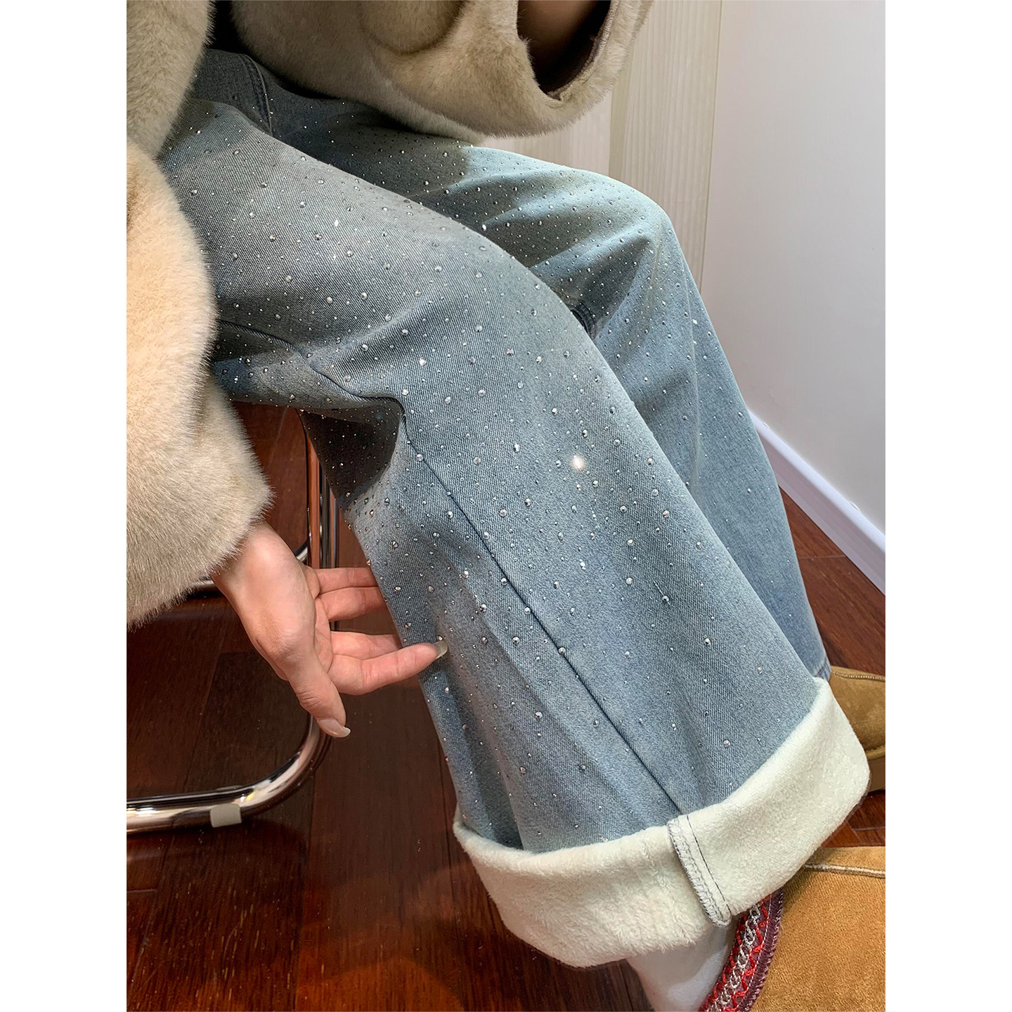 美式高街烫钻牛仔裤女冬季加绒胖妹妹mm高腰宽松显瘦直筒阔腿长裤
