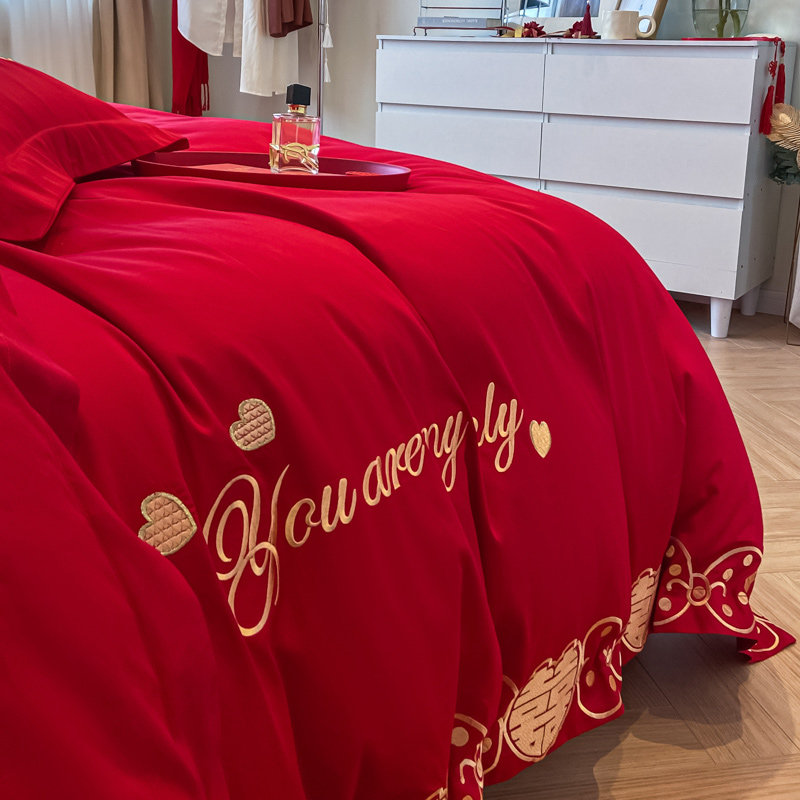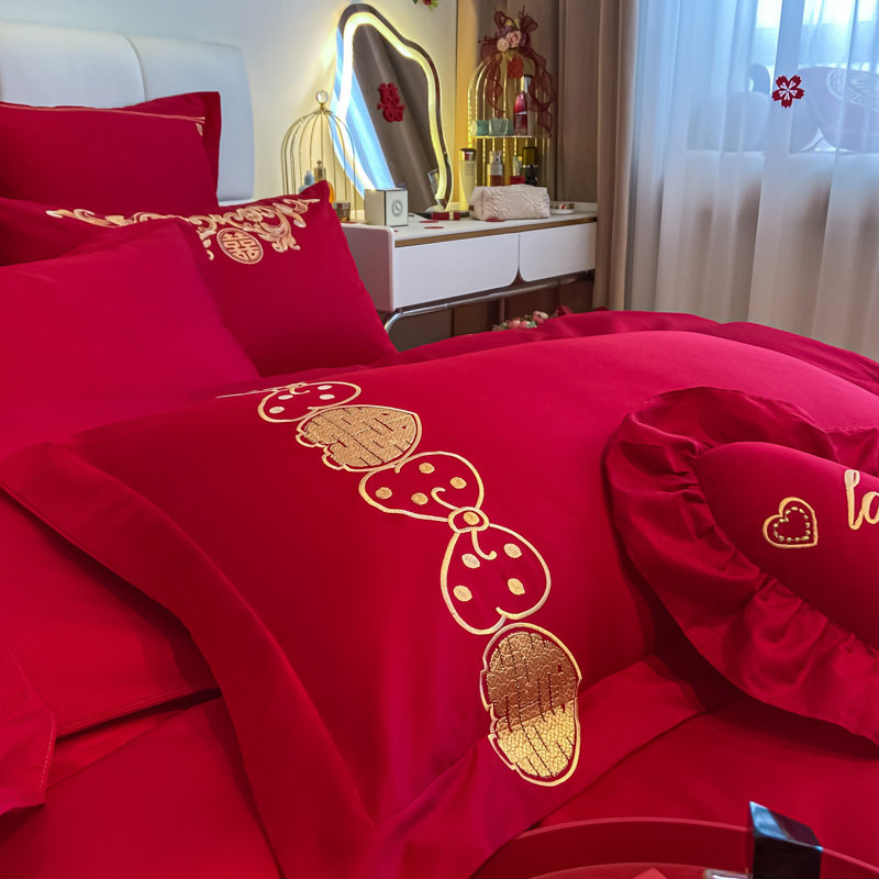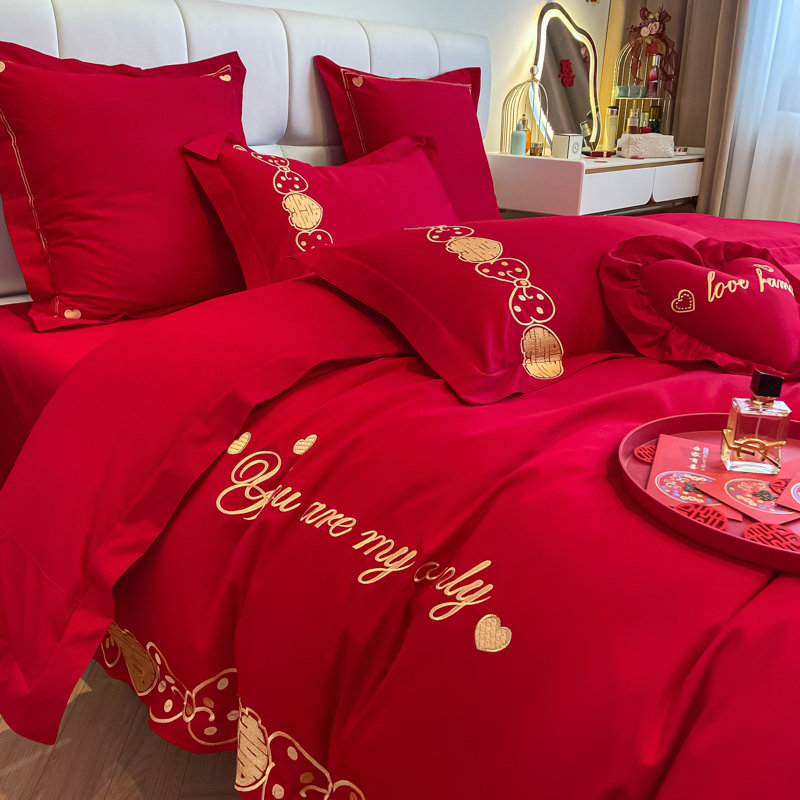 纯棉新婚庆四件套大红色全棉刺绣结婚床品双人婚嫁八件套被套喜被