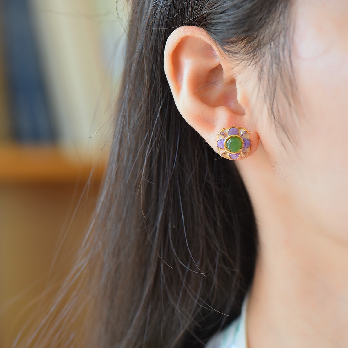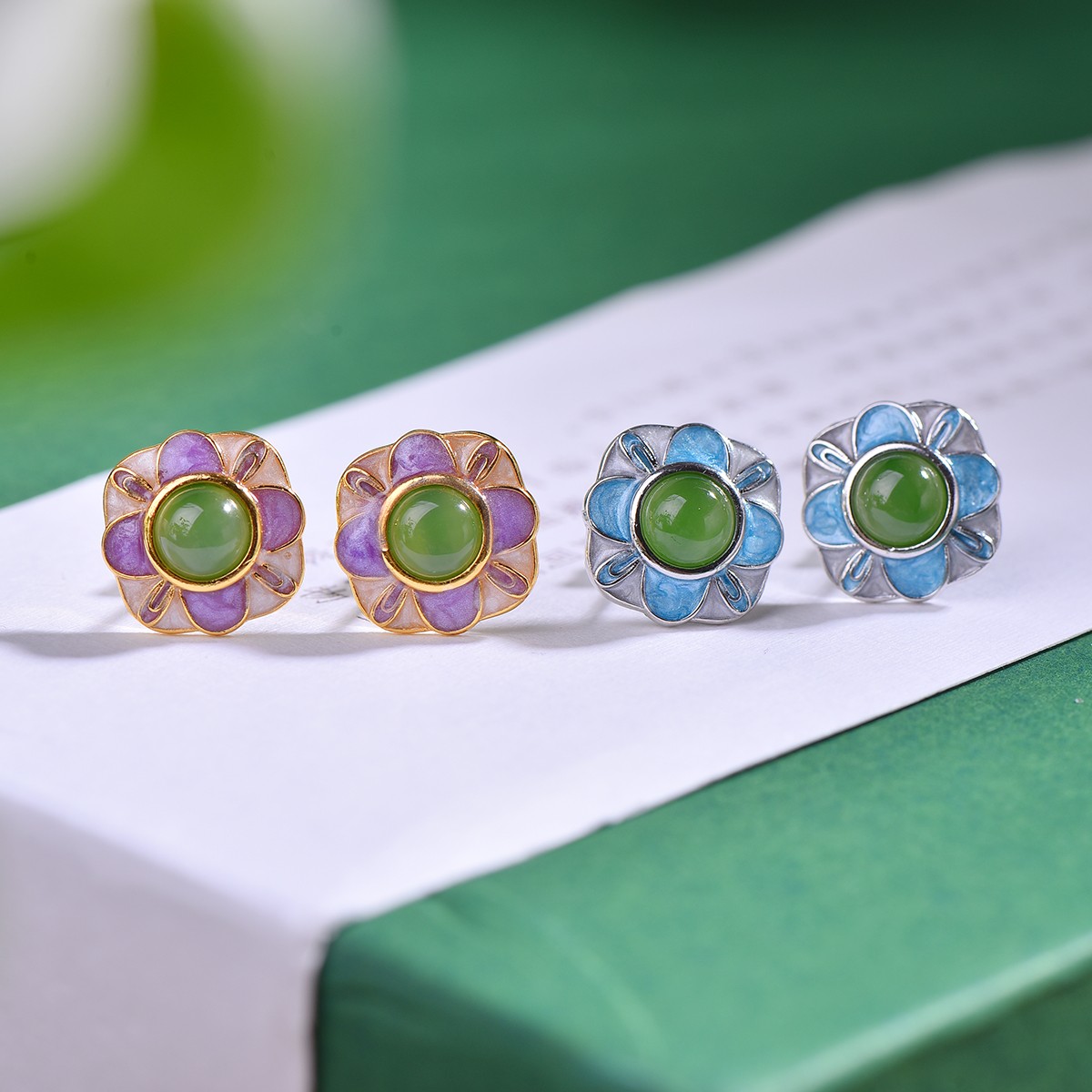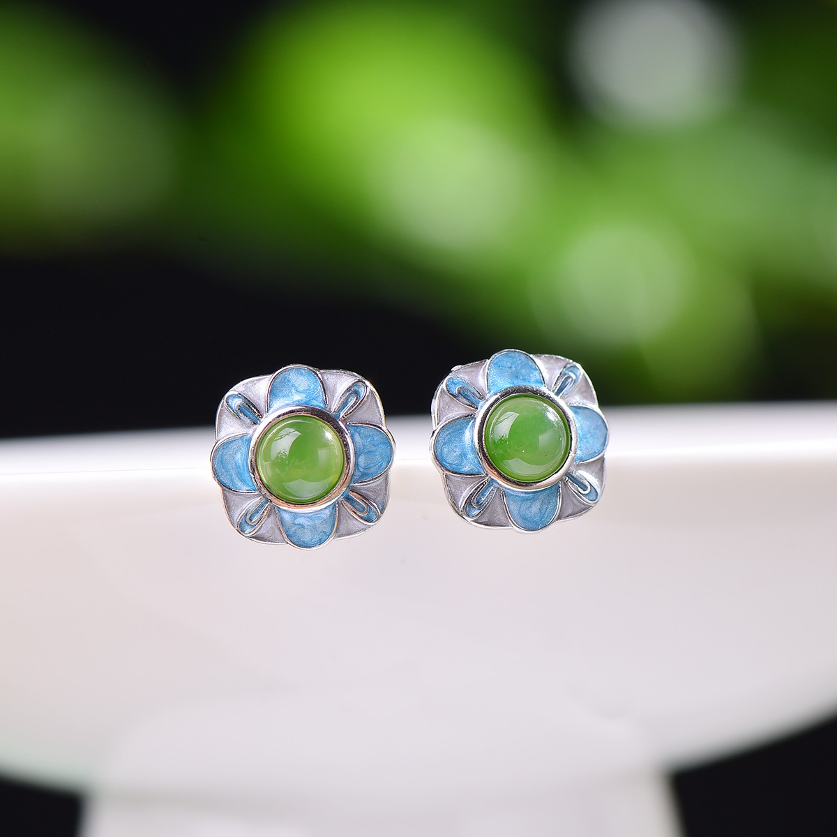 天然和田玉碧玉925银镶嵌珐琅彩太阳花玉石耳钉耳环耳饰